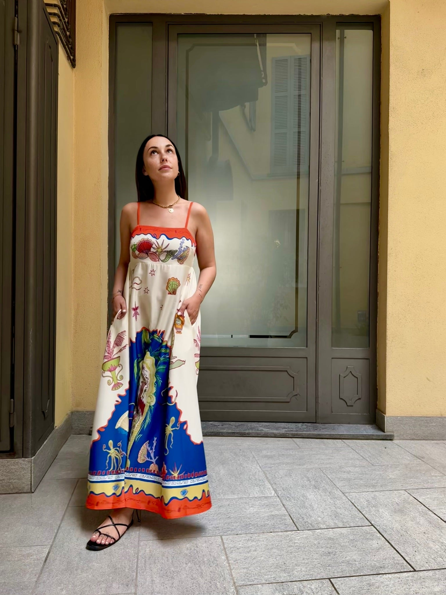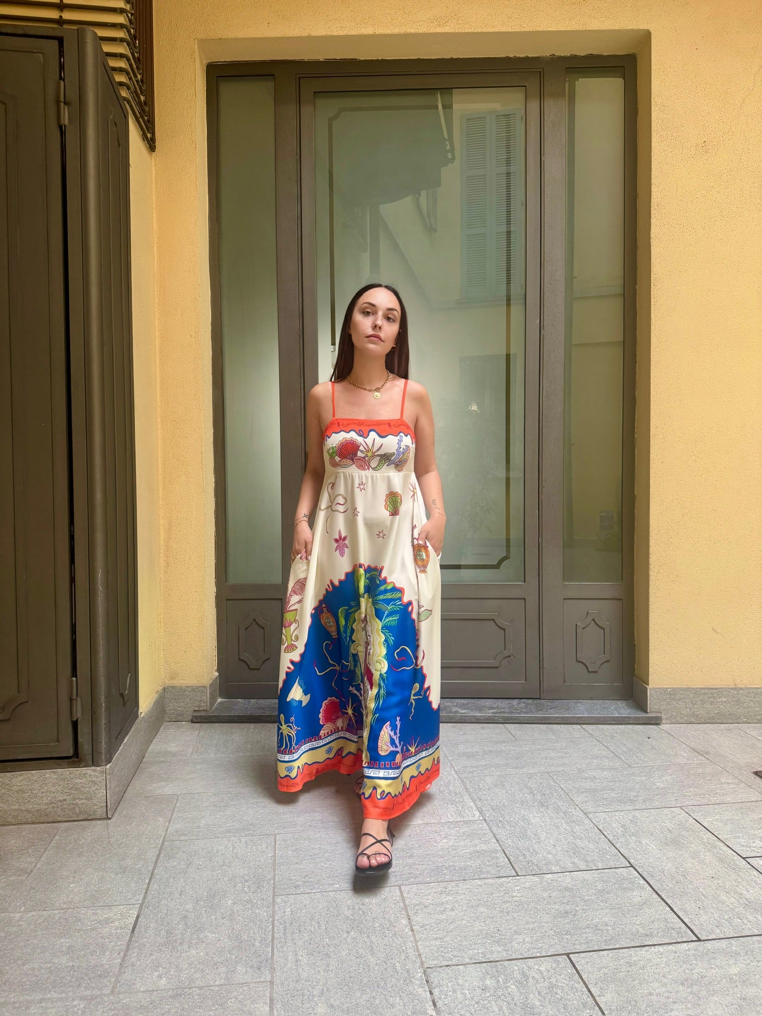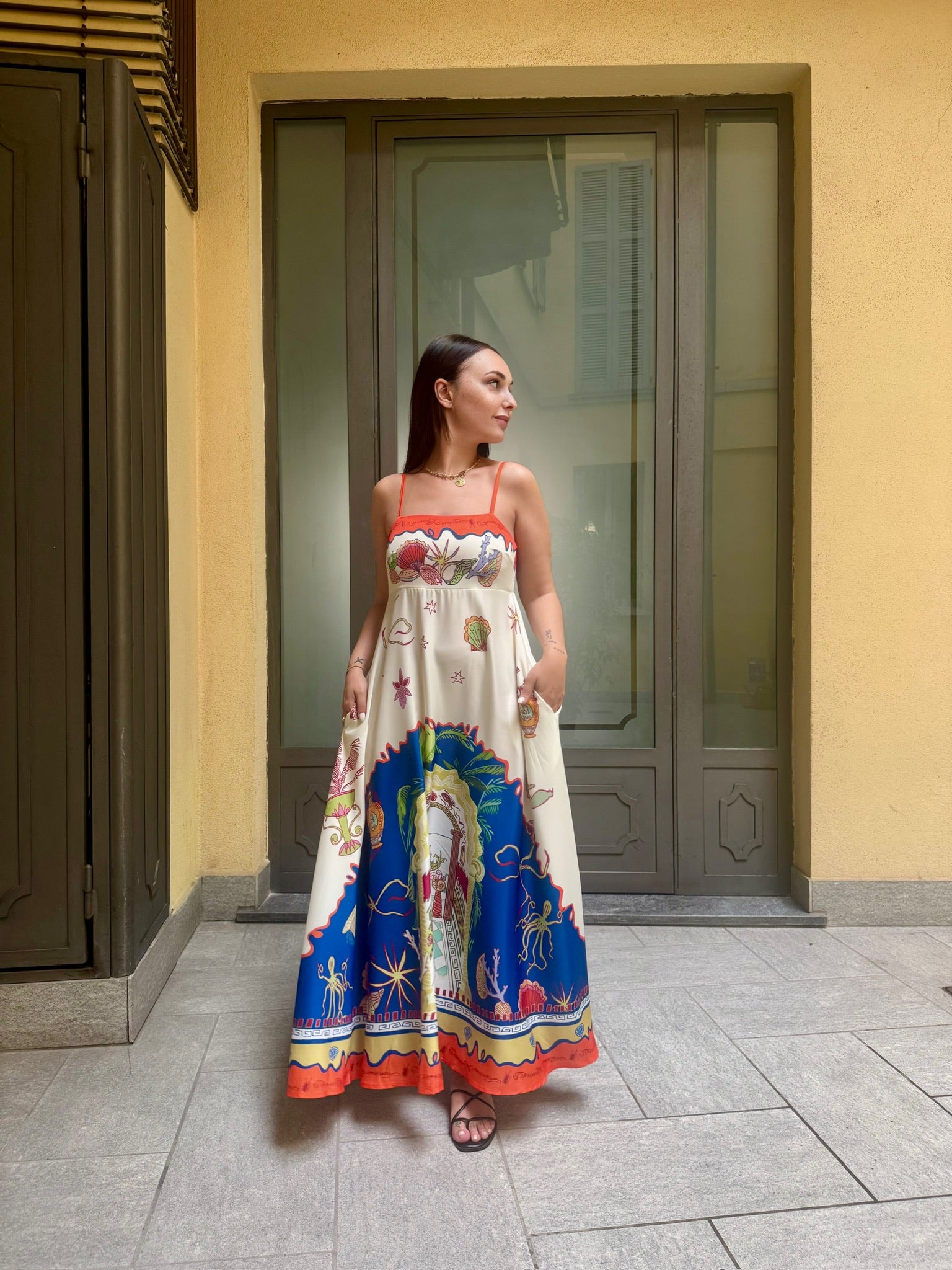 Abito lungo in tessuto fluido e leggero, spalline sottili, taglio sotto al seno. elastico sul retro a nido d'ape. Tasche laterali invisibili.