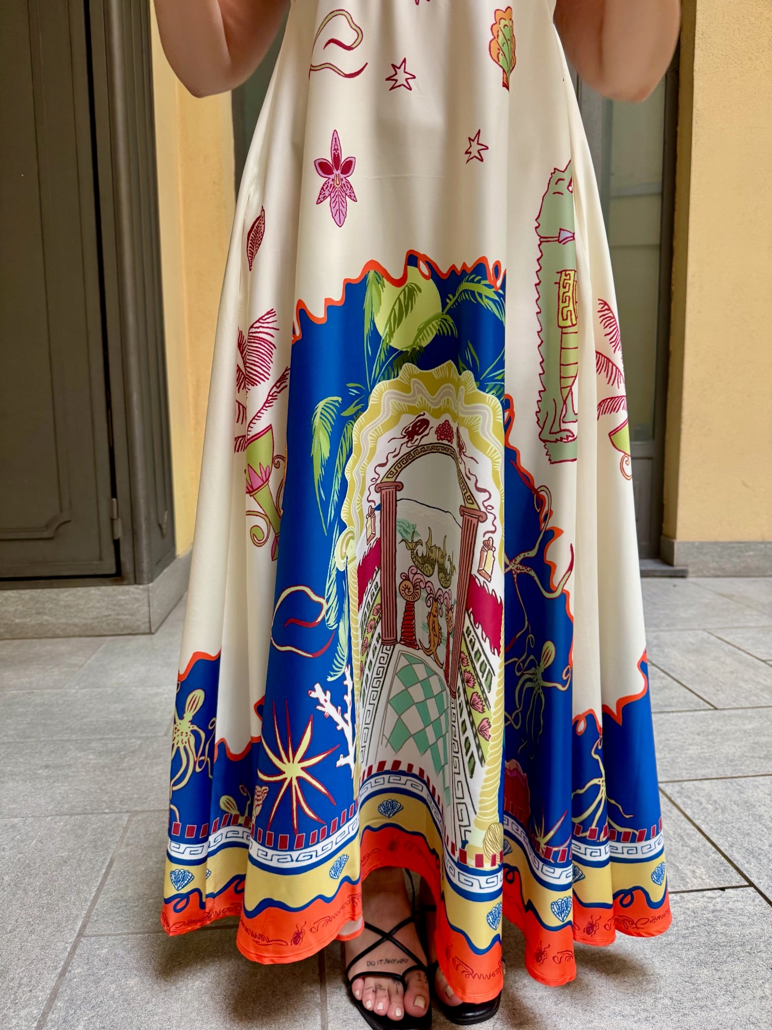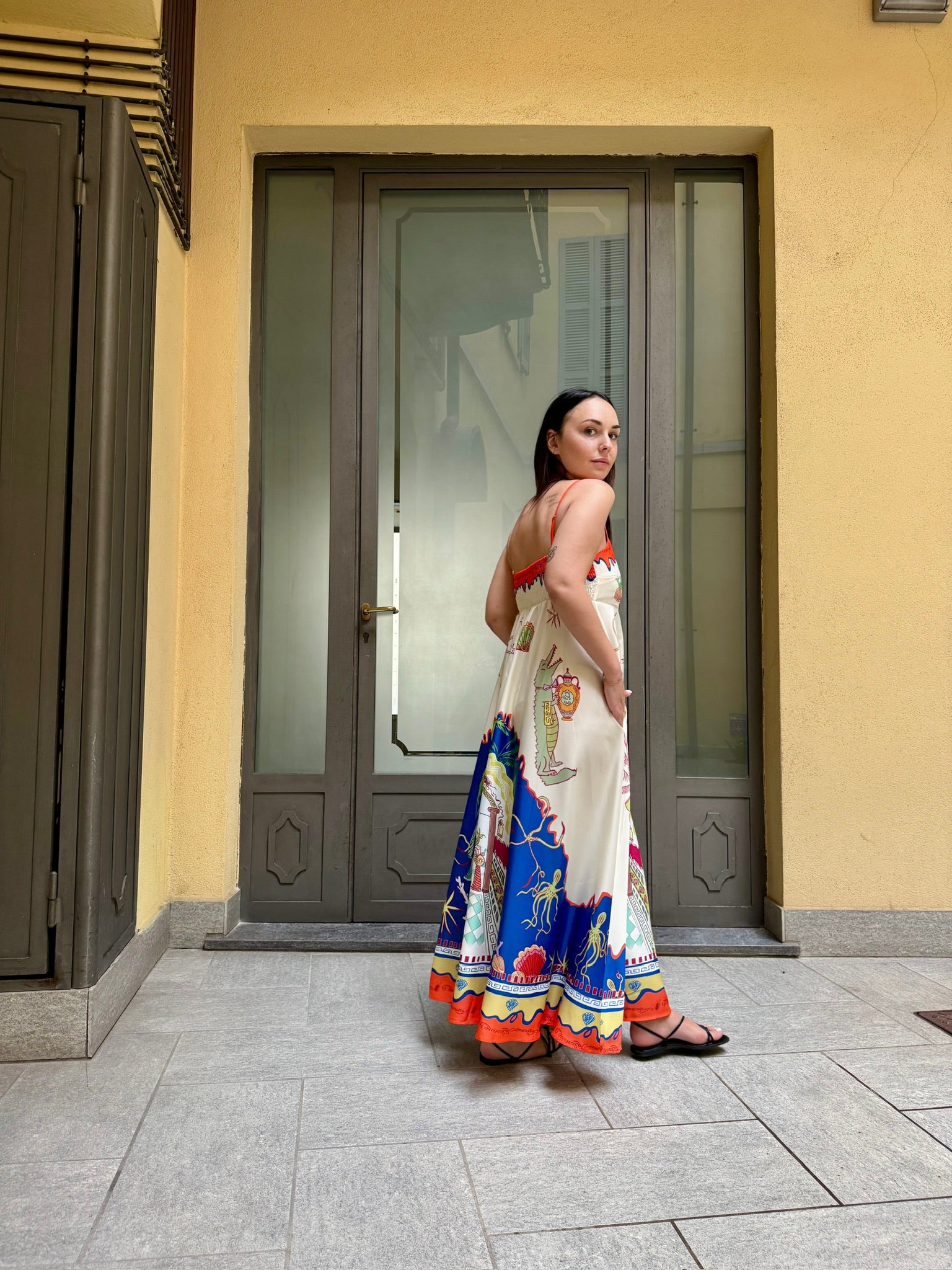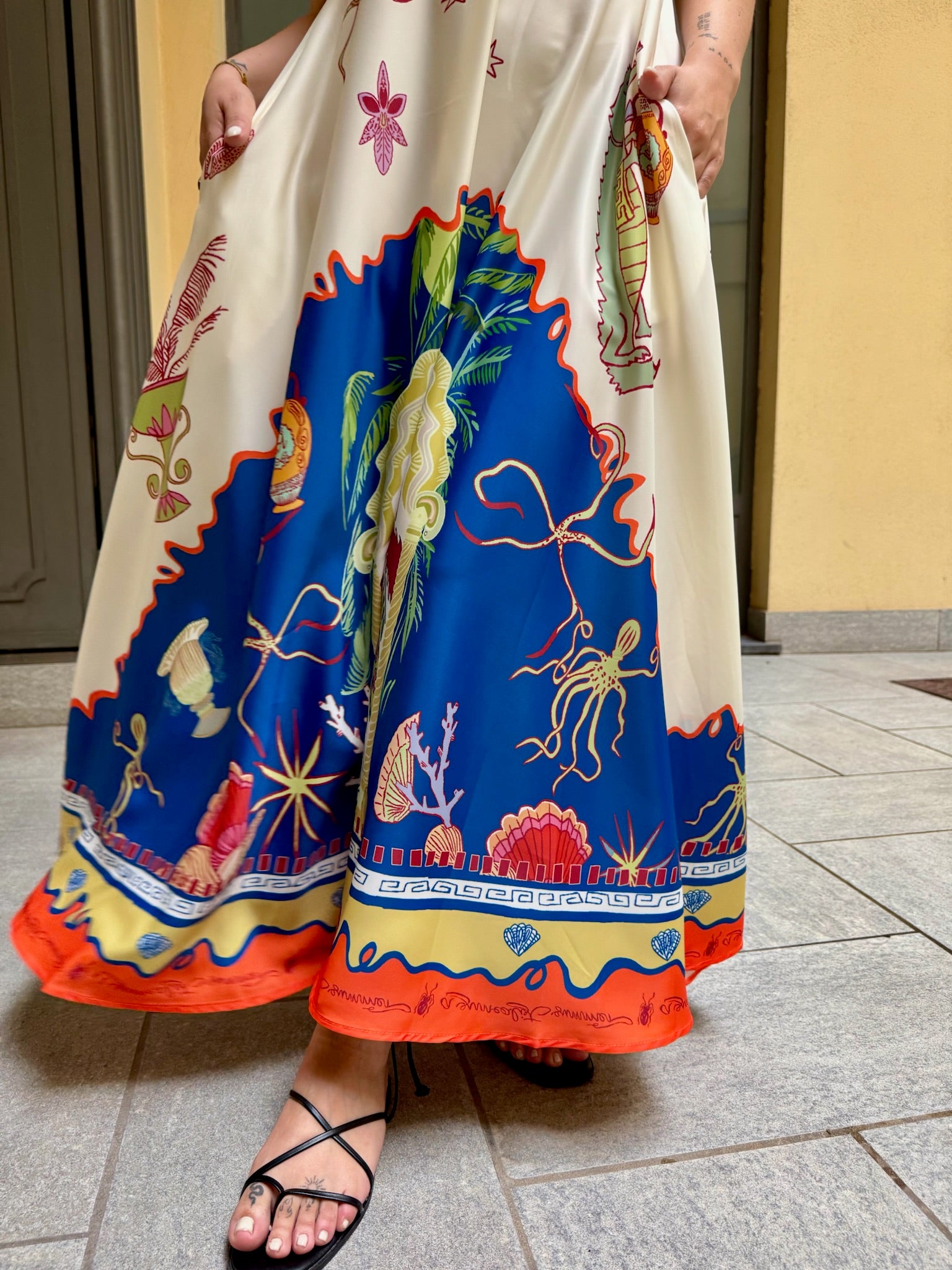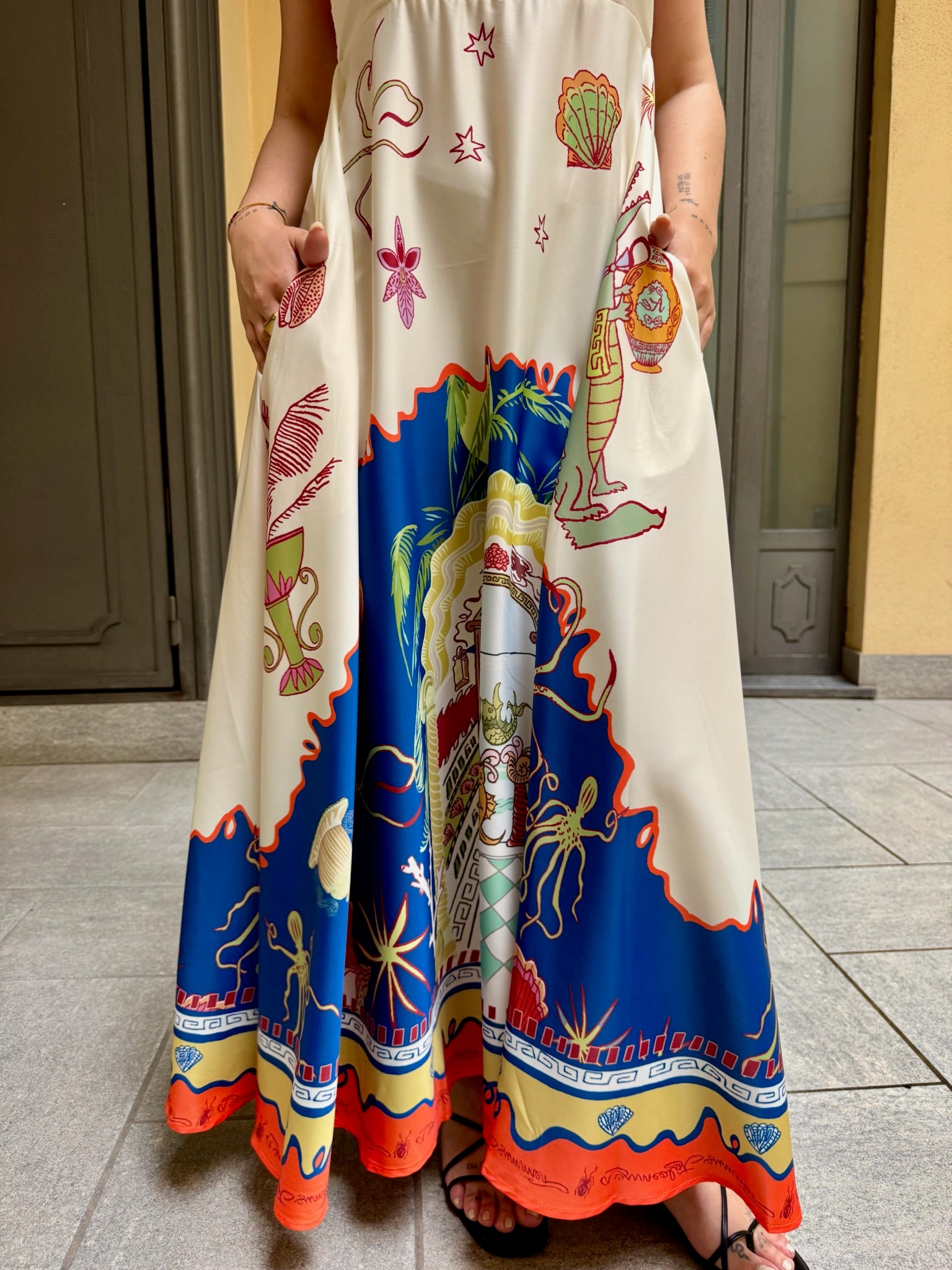 Abito lungo in tessuto fluido e leggero, spalline sottili, taglio sotto al seno. elastico sul retro a nido d'ape. Tasche laterali invisibili.