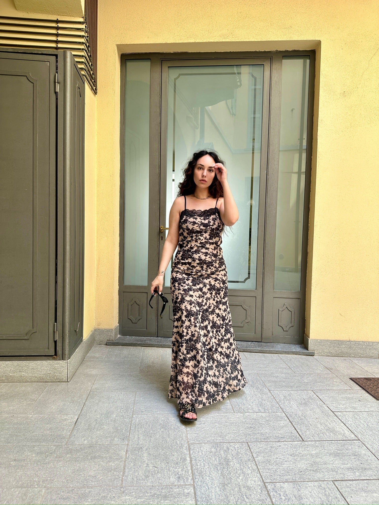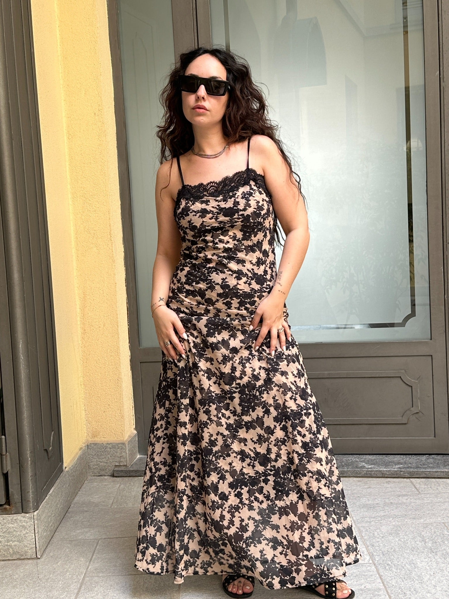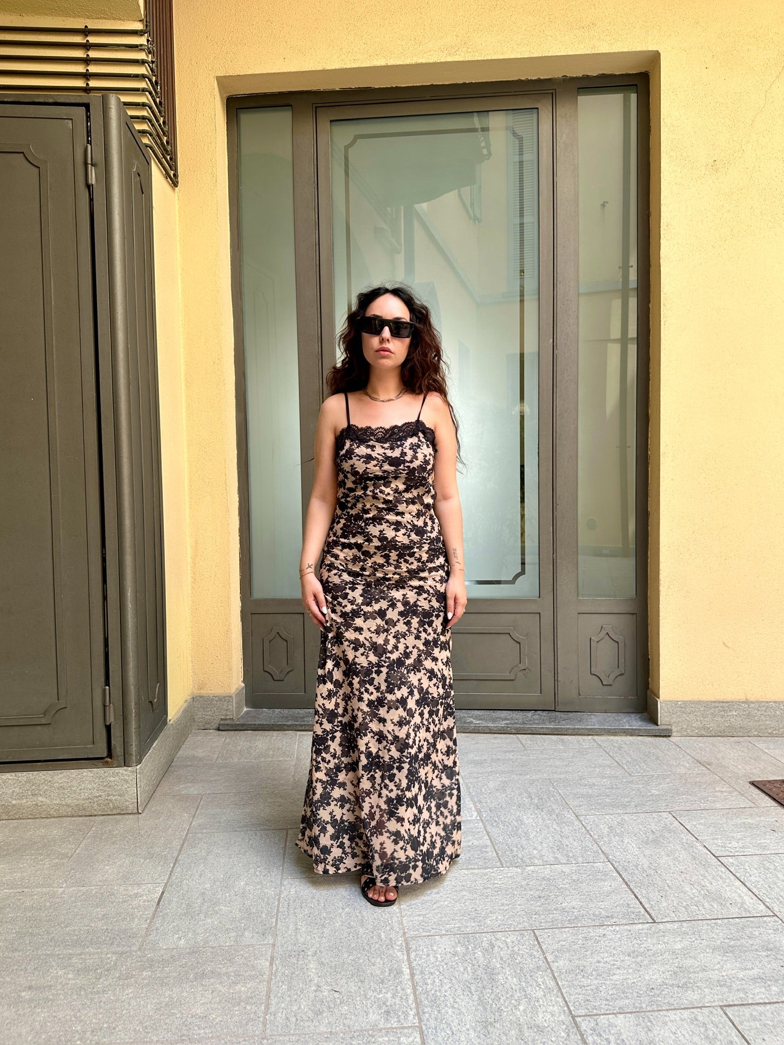 Abito lungo taglio a sirena doppiato con trasparenza del primo tessuto fantasia con le rose, pizzo e spalline regolabile, zip laterale e bottoncini a chiusura laterali.