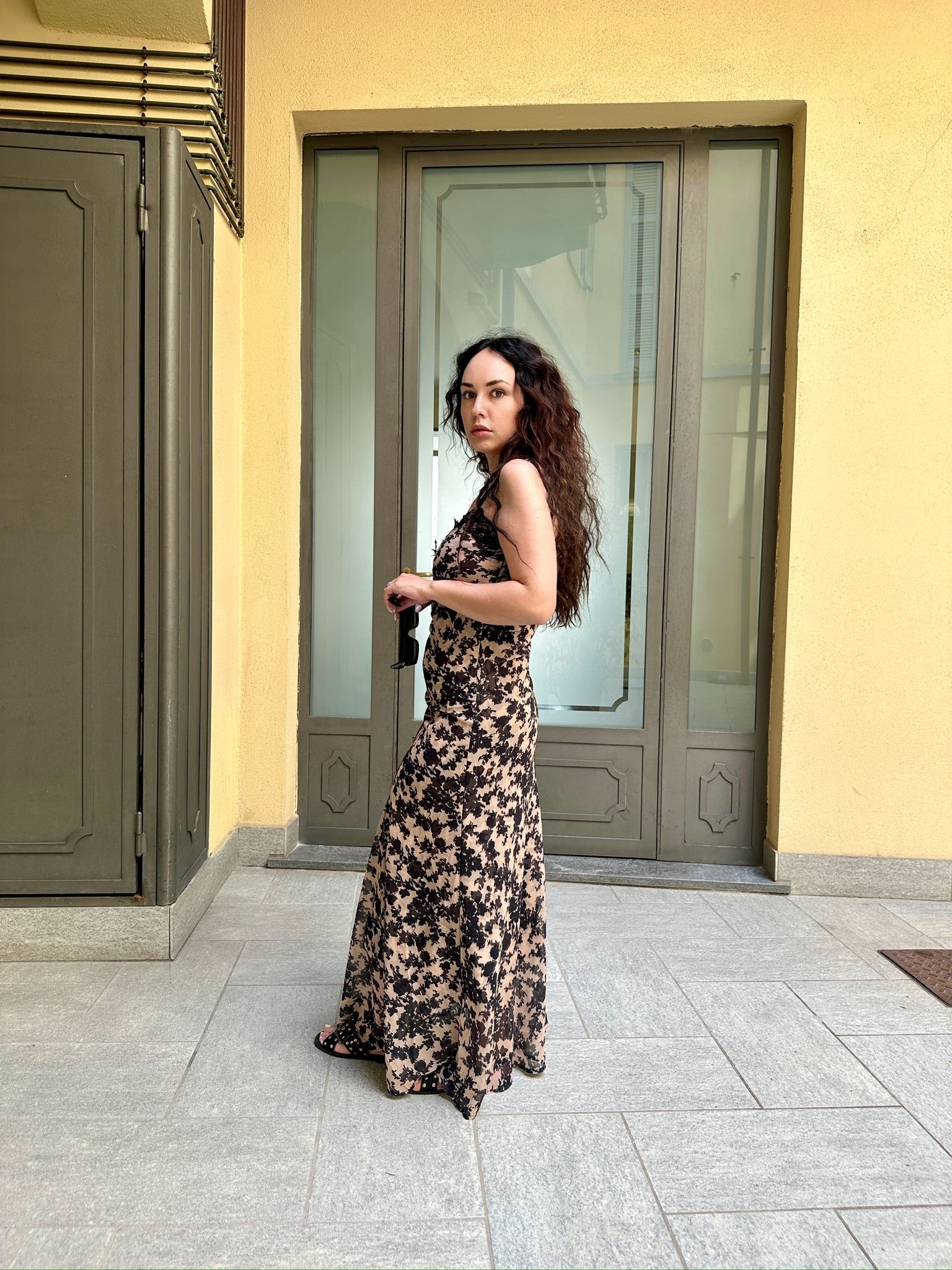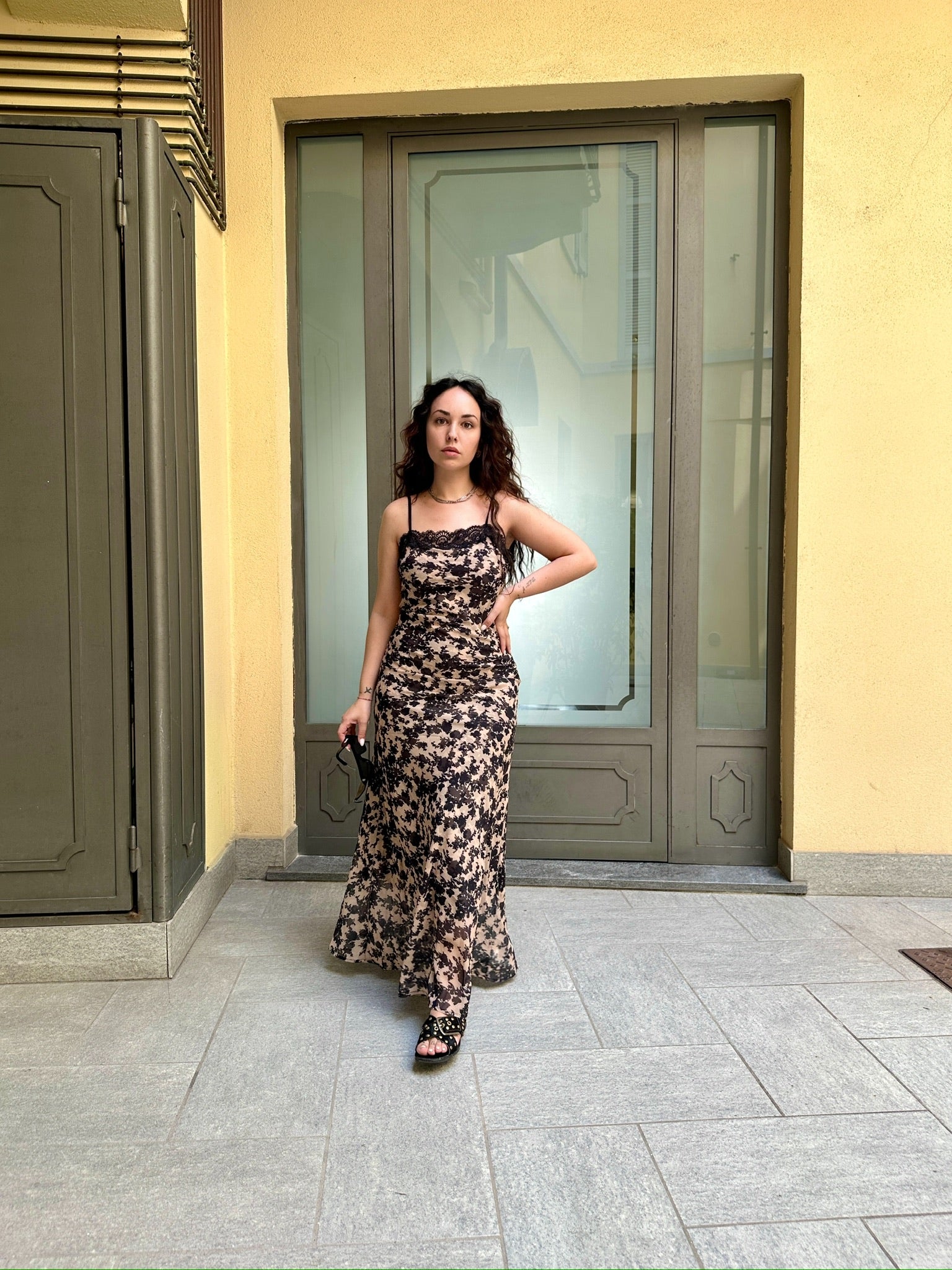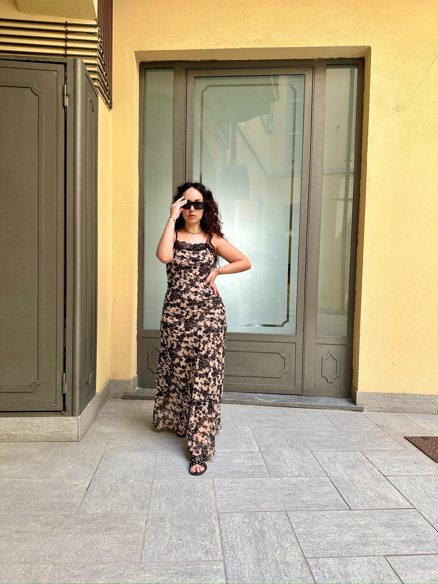 Abito lungo taglio a sirena doppiato con trasparenza del primo tessuto fantasia con le rose, pizzo e spalline regolabile, zip laterale e bottoncini a chiusura laterali.