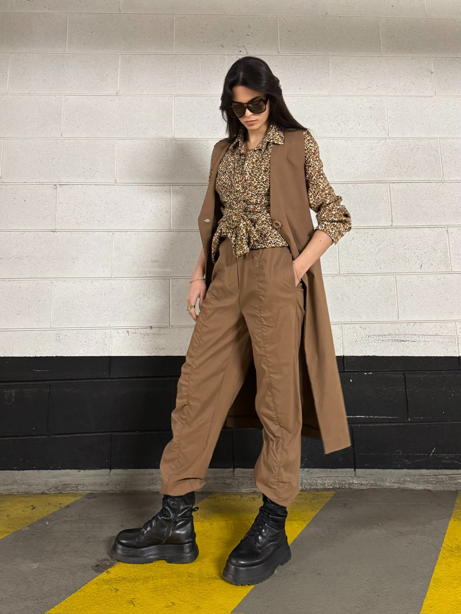 Camicia leopardata in viscosa senza bottoni con profondo scollo a V e nodo sul davanti.