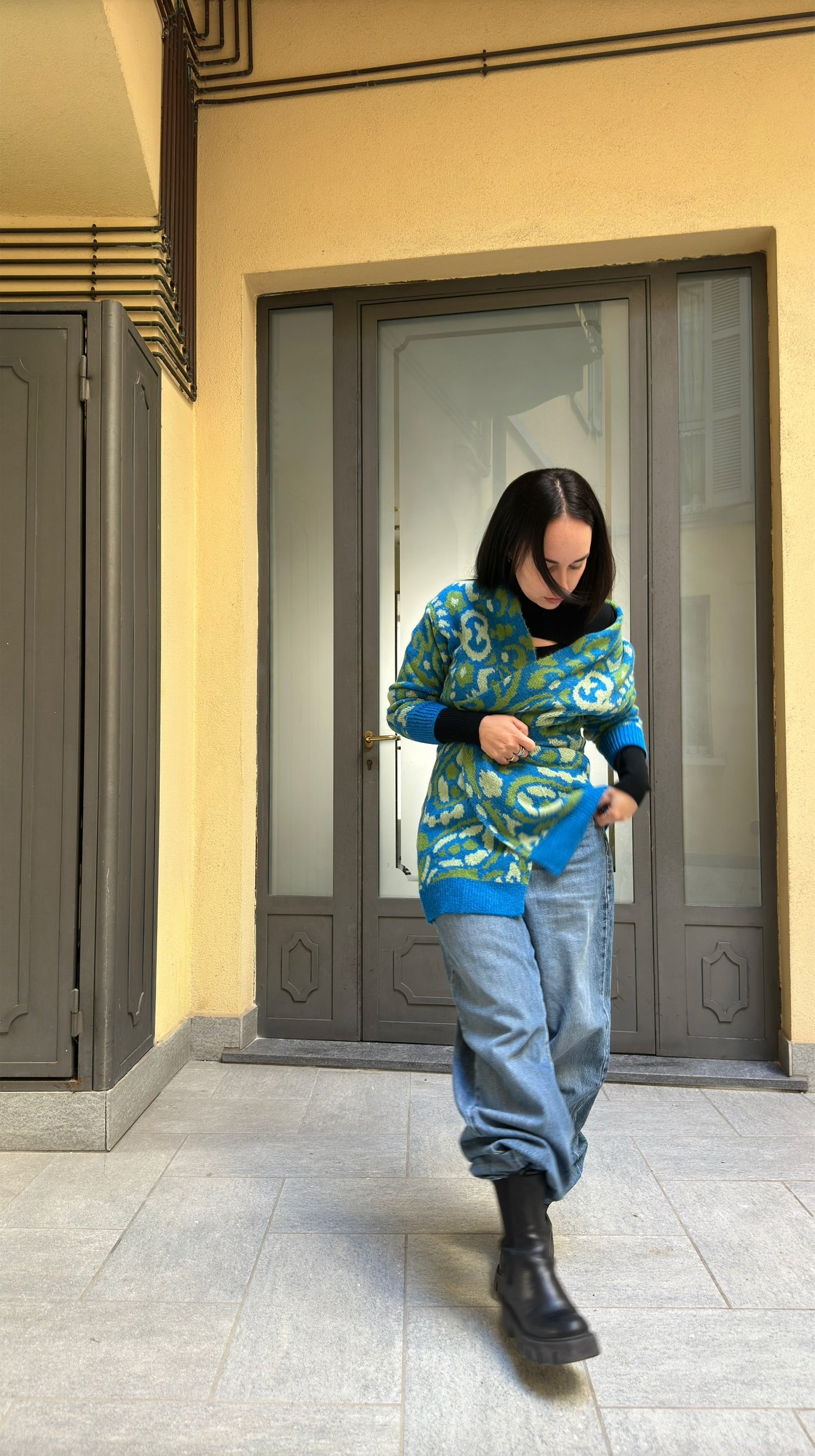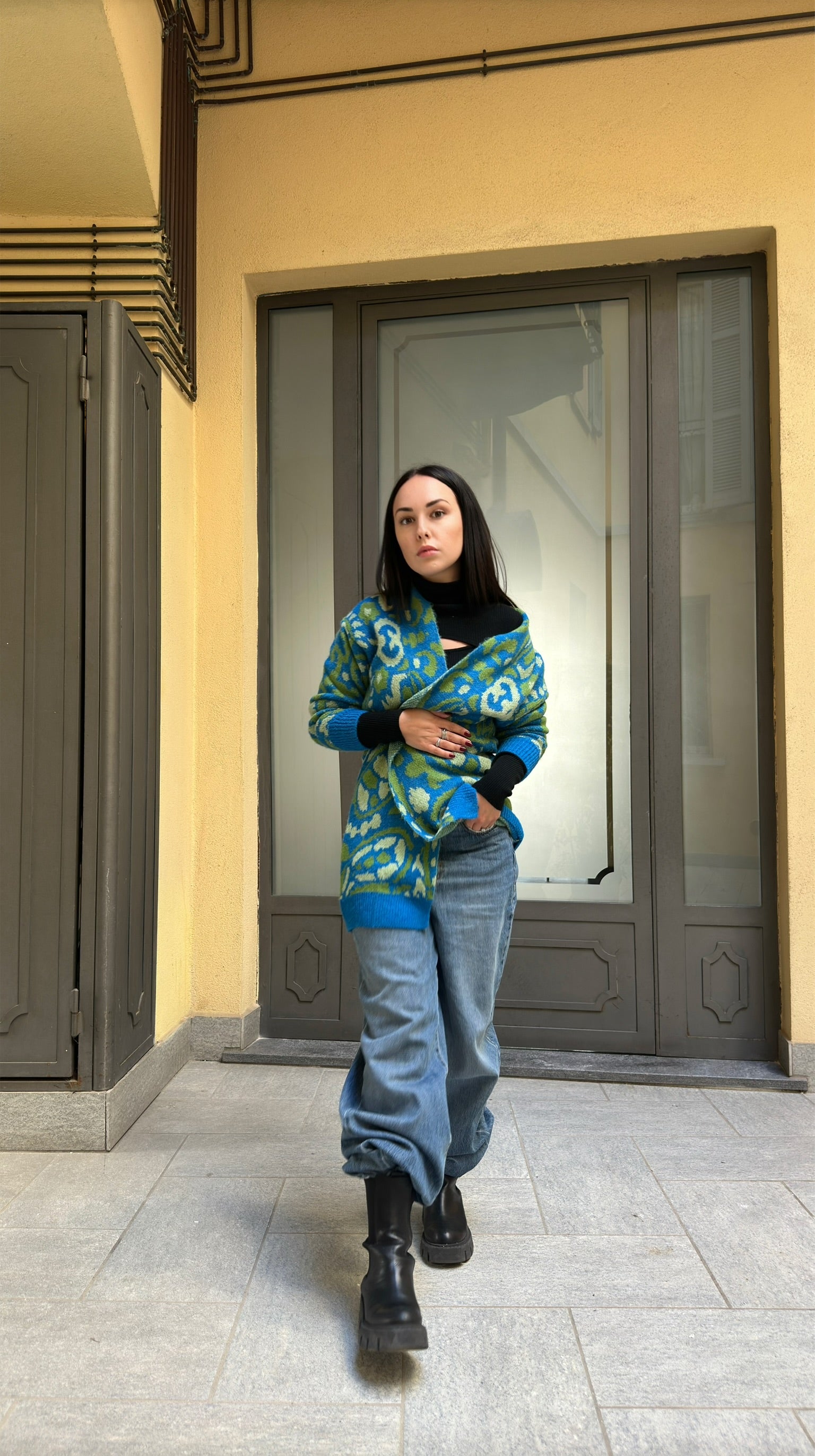 Cardigan lungo senza bottoni in fantasia con colori a contrasto.