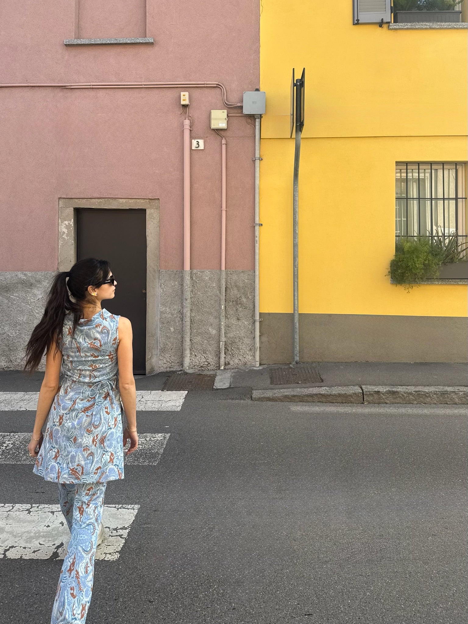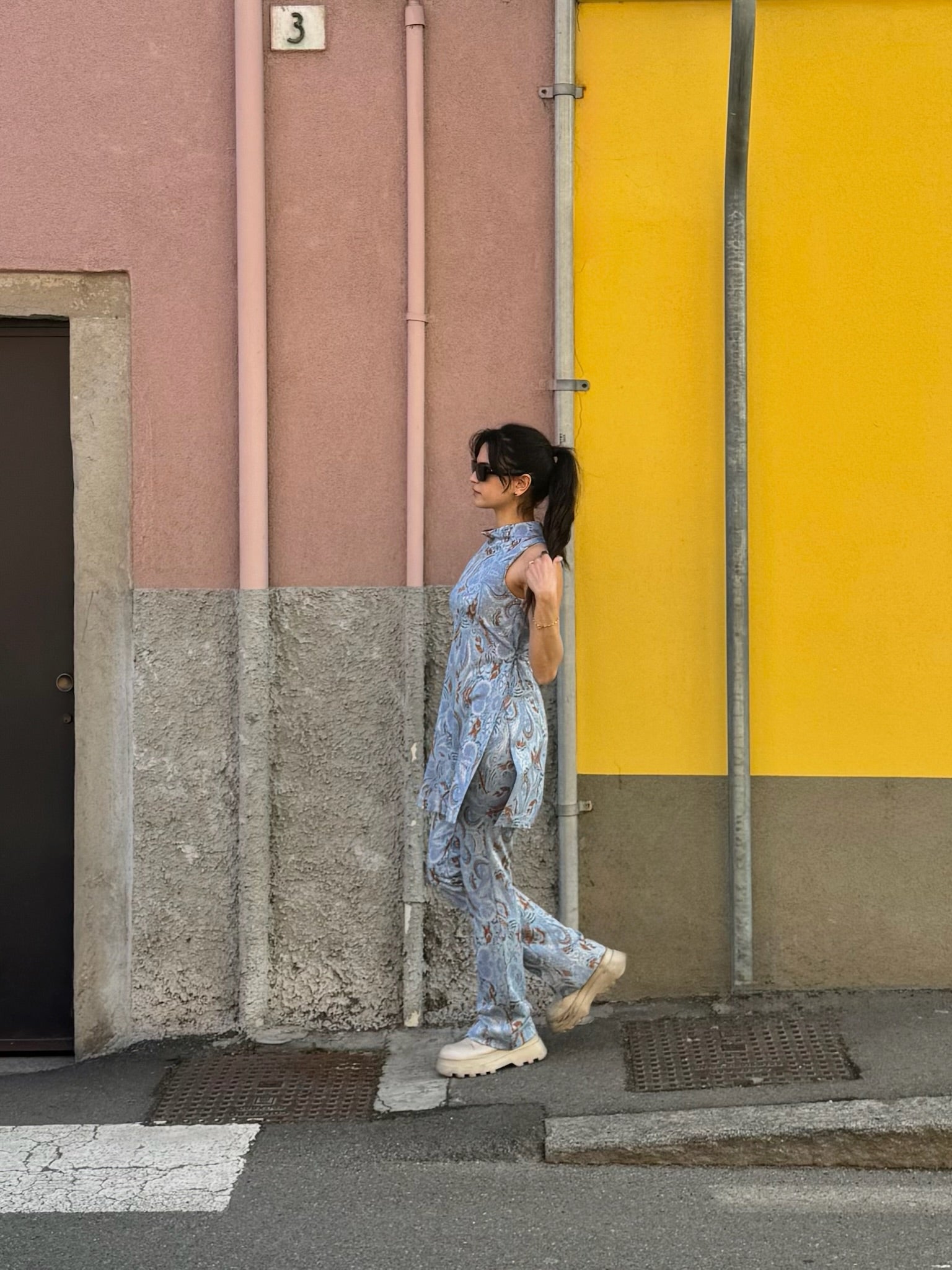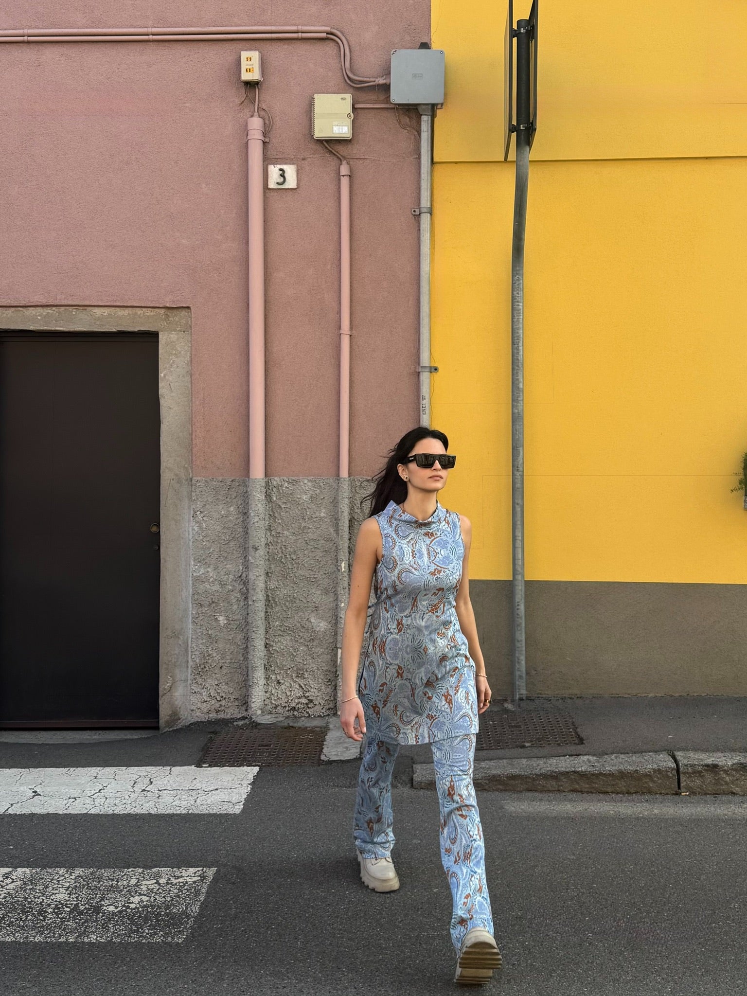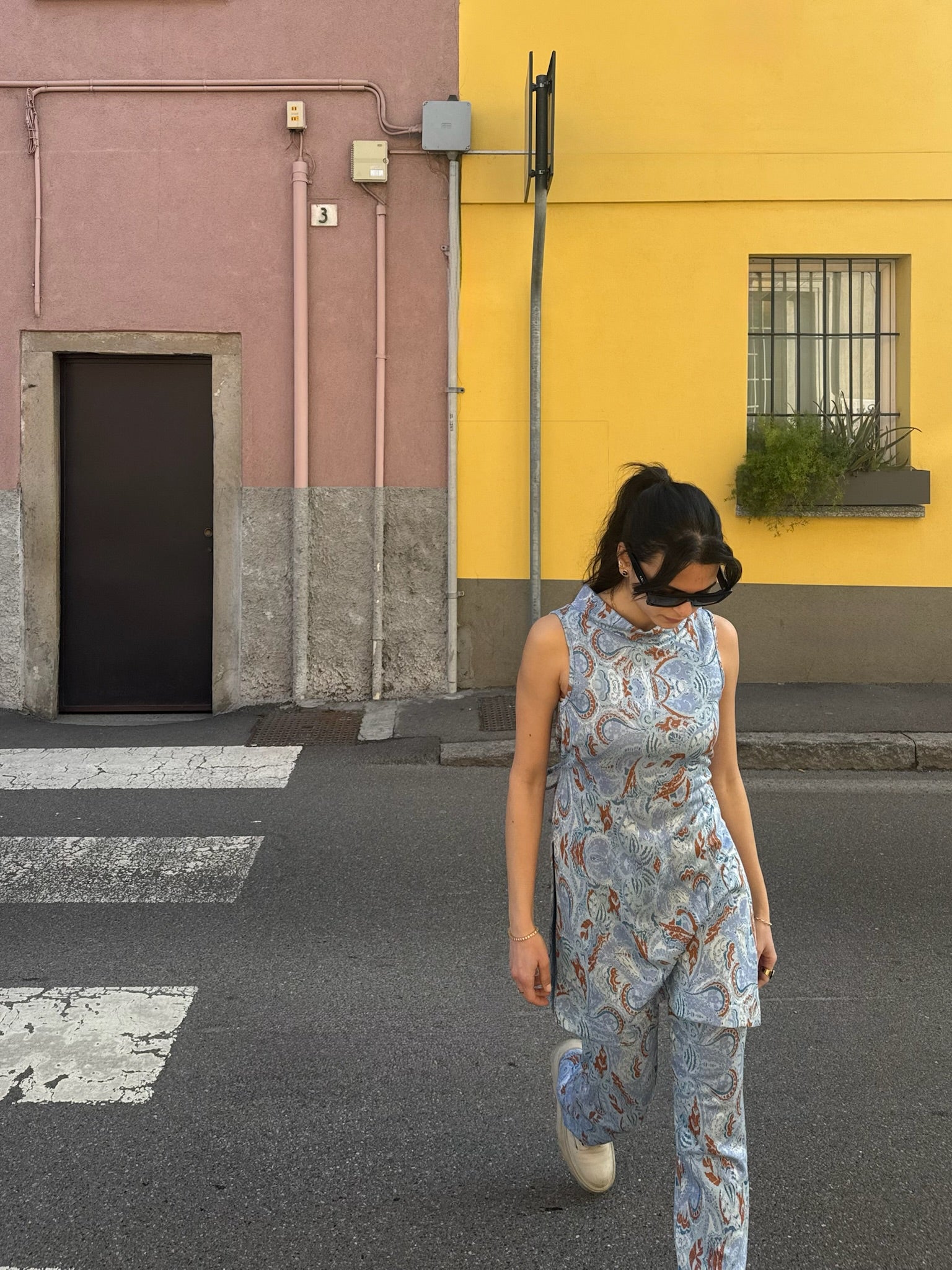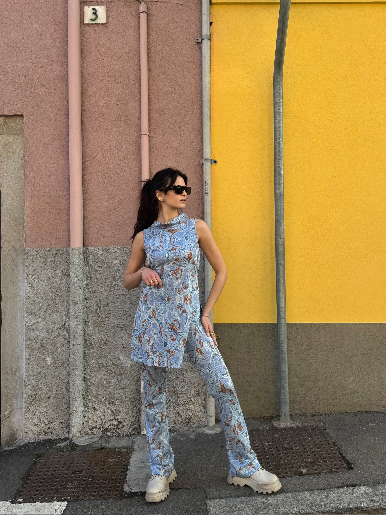 Completo pantalone e casacca in tessuto jacquard con fantasia paisley. Il pantalone a zampa con elastico in vita senza aperture, la casacca a canotta con collo a ciambella spacchi laterali e cintura dello stesso tessuto in vita.