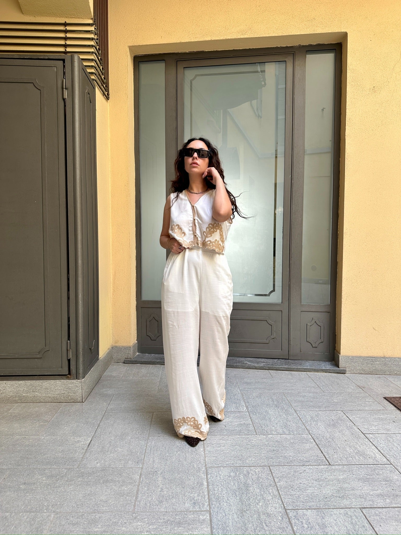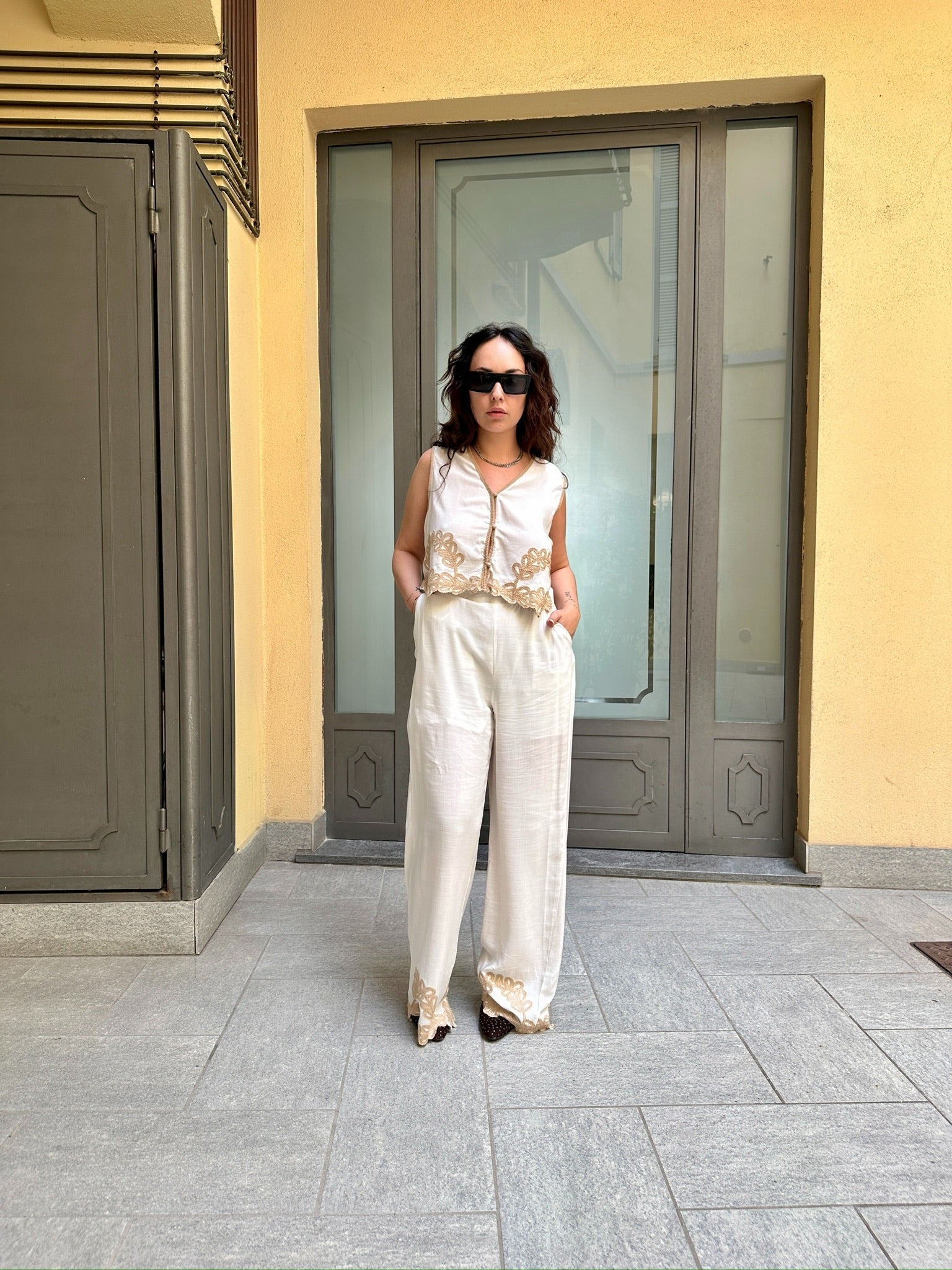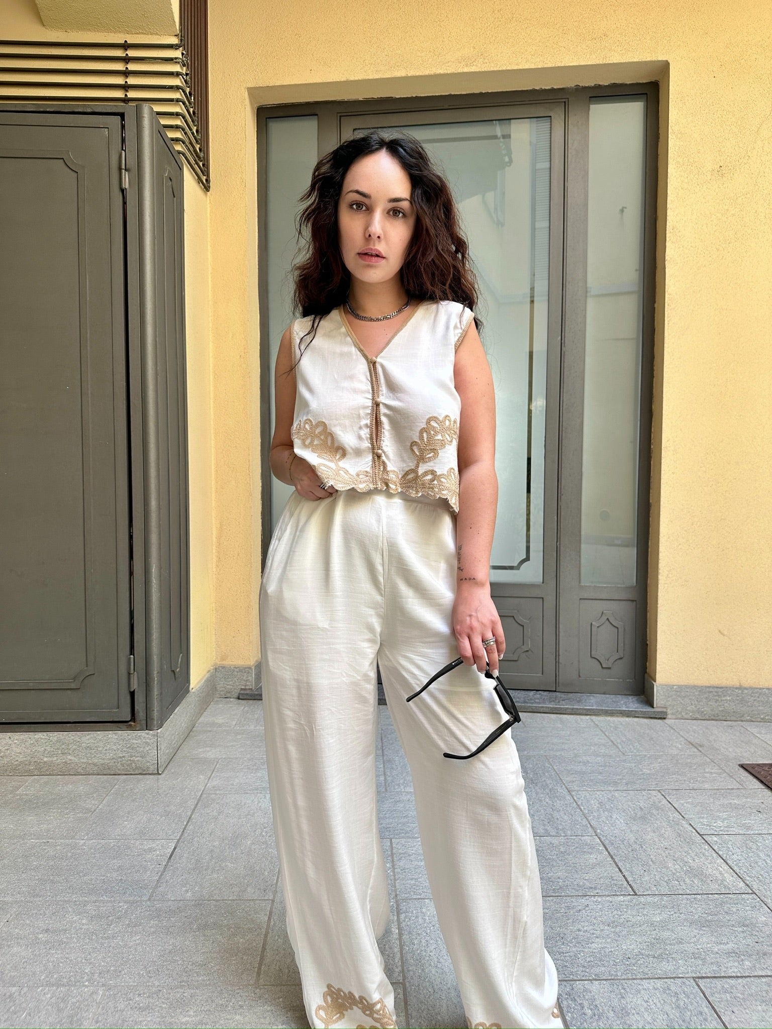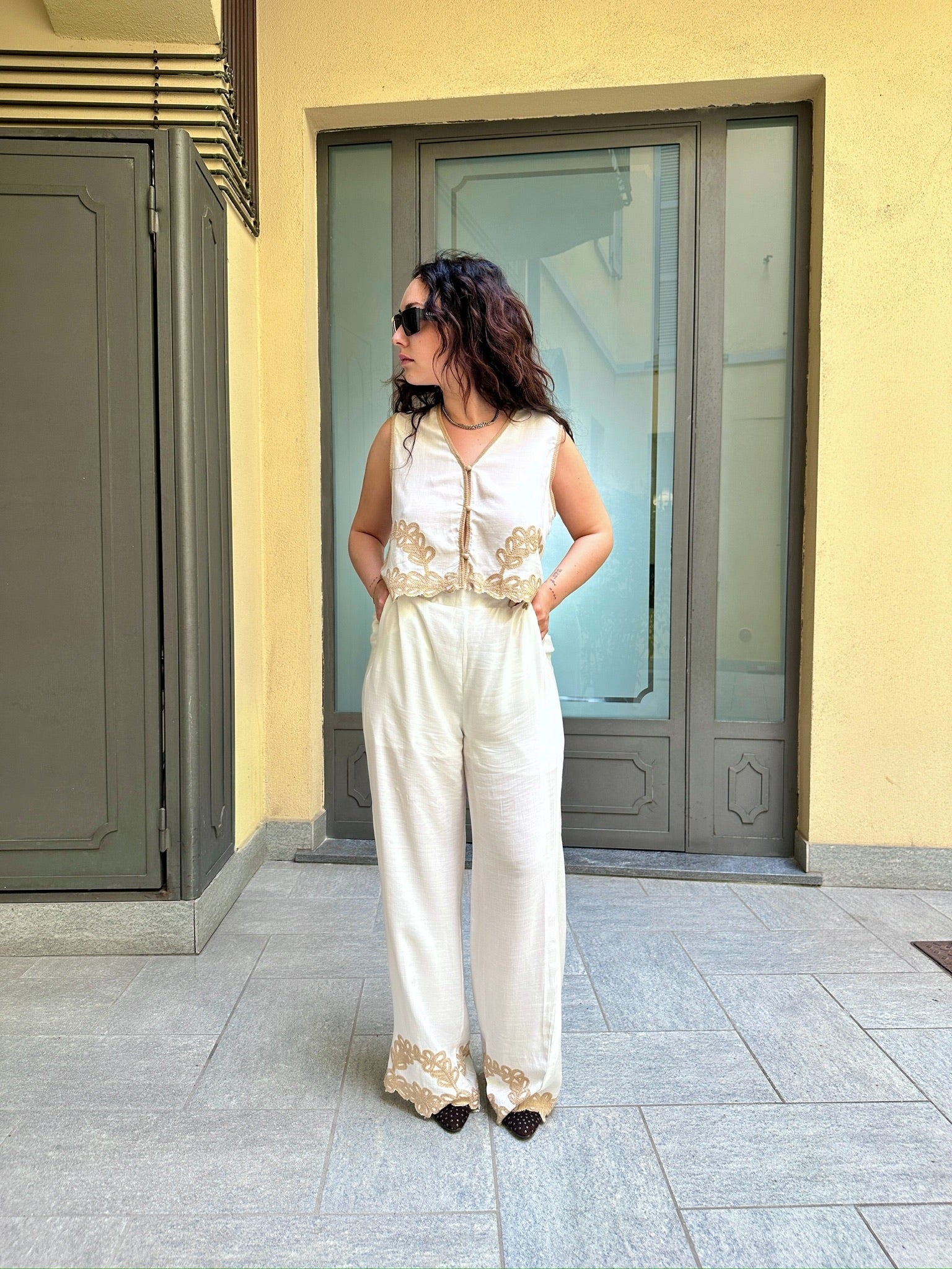 Completo in 100% viscosa, con bordature e ricami effetto macramè. Gilet con abbottonatura tramite piccoli bottoncini del colore del ricamo.