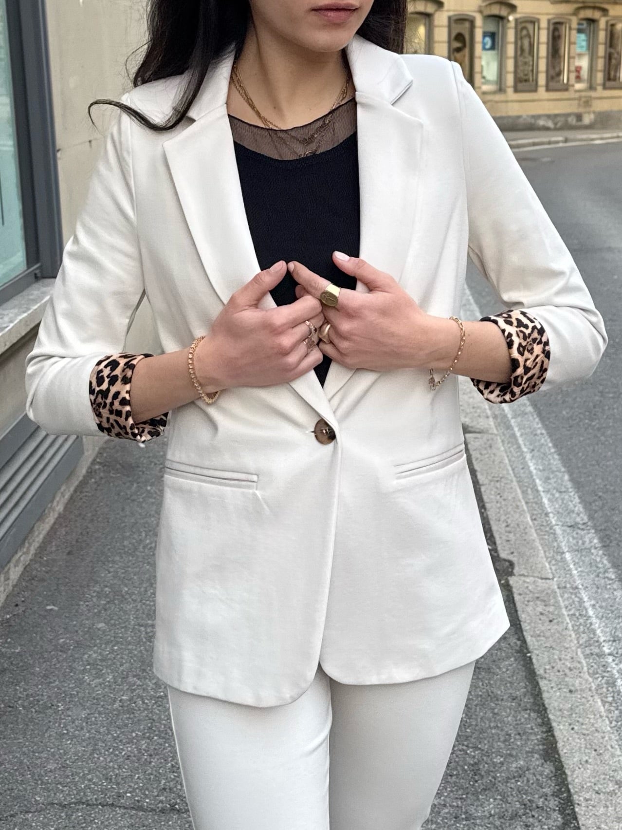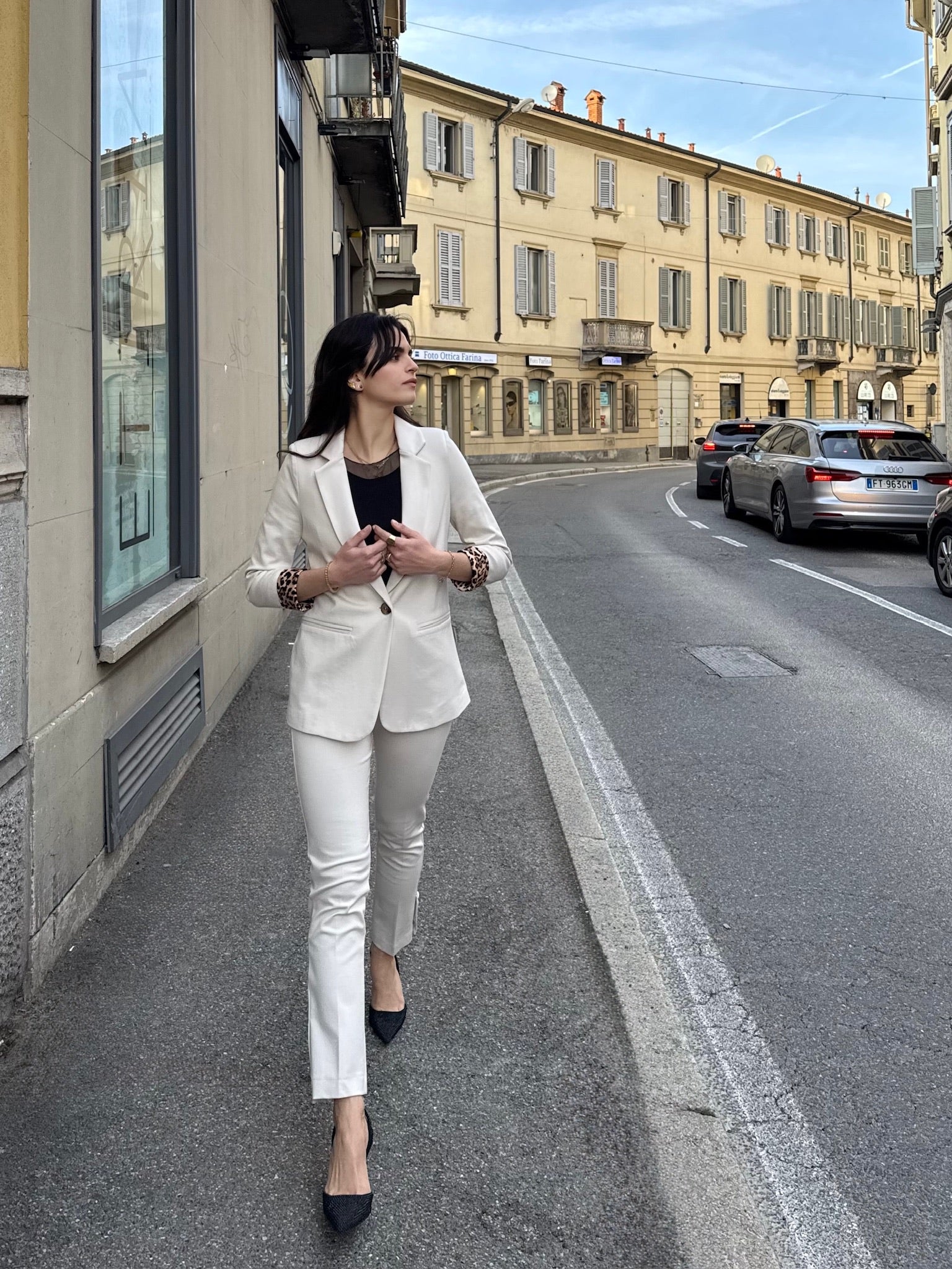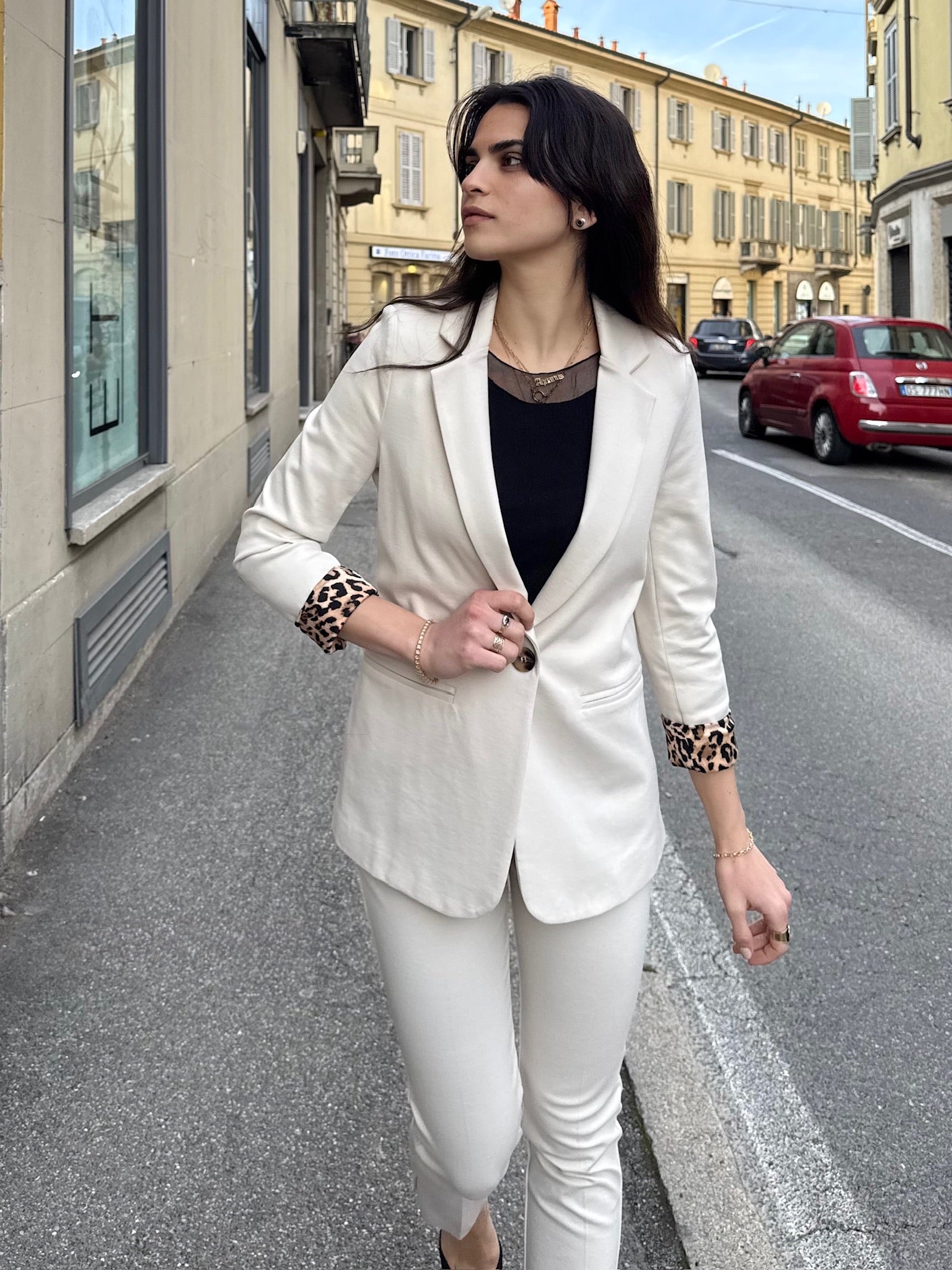 Completo in Jersey punto Milano con fodera in fantasia leopardata, vestibilità aderente della giacca e del pantalone. Pantalone a sigaretta con bottoni sul fondo a decorazione.