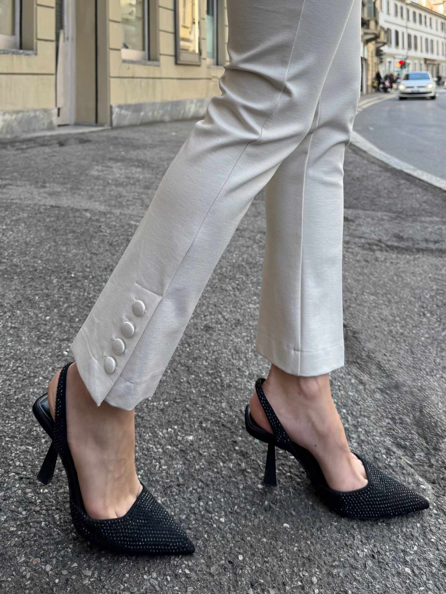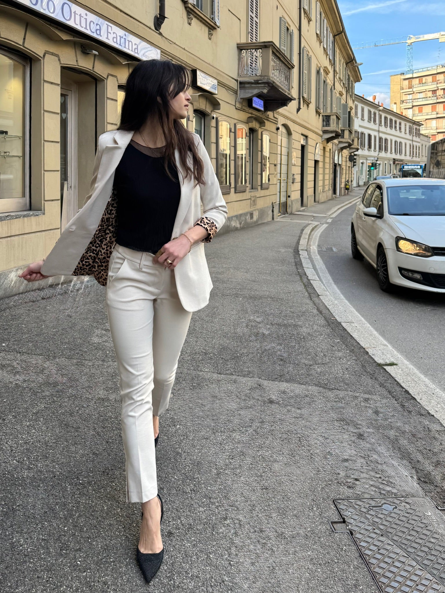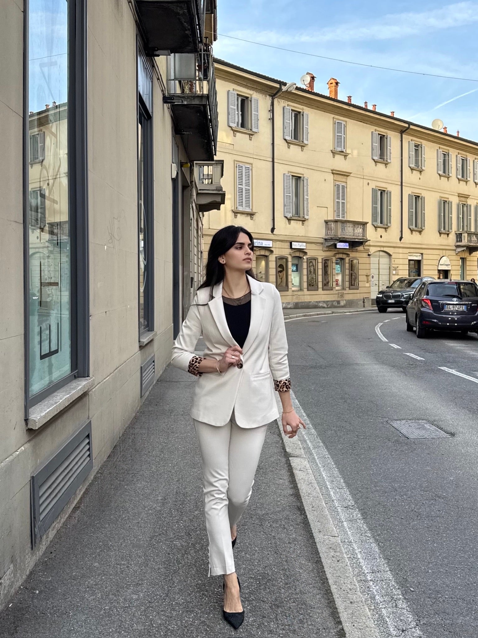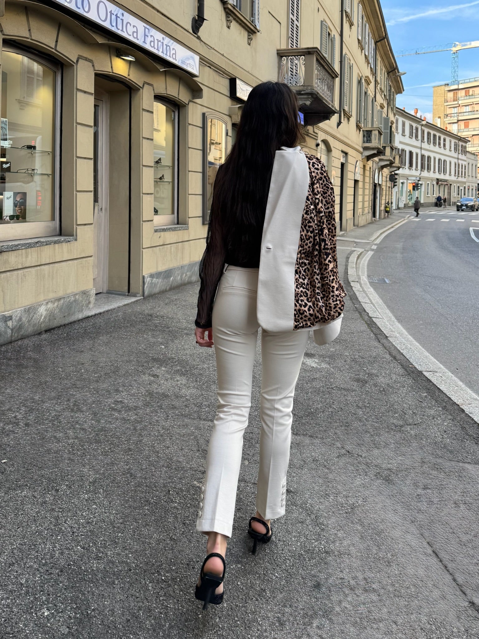 Completo in Jersey punto Milano con fodera in fantasia leopardata, vestibilità aderente della giacca e del pantalone. Pantalone a sigaretta con bottoni sul fondo a decorazione.