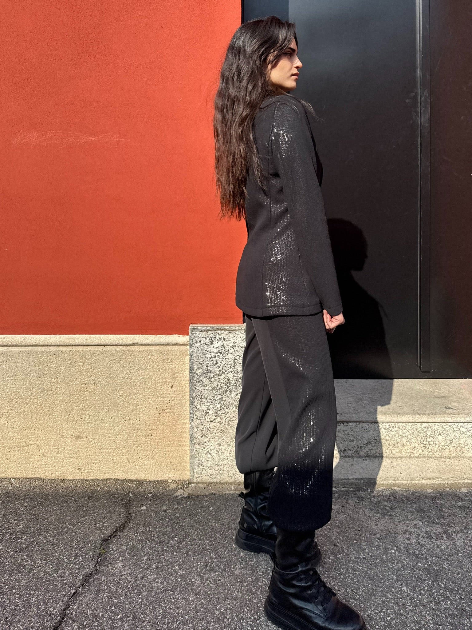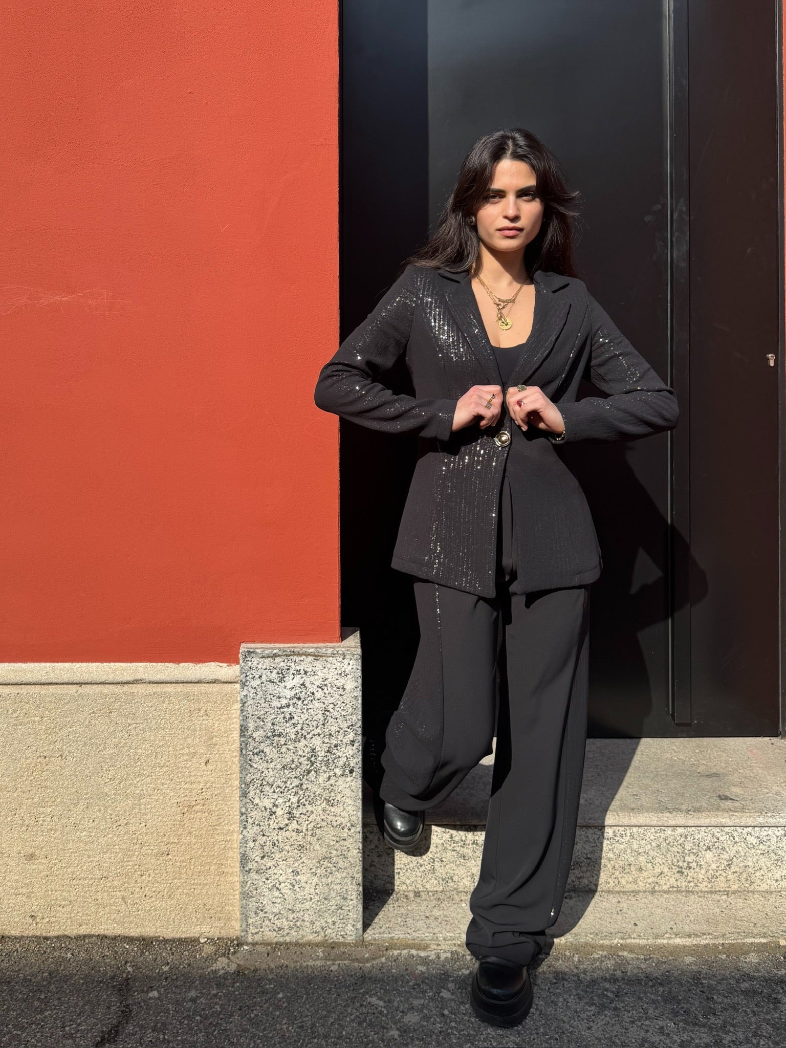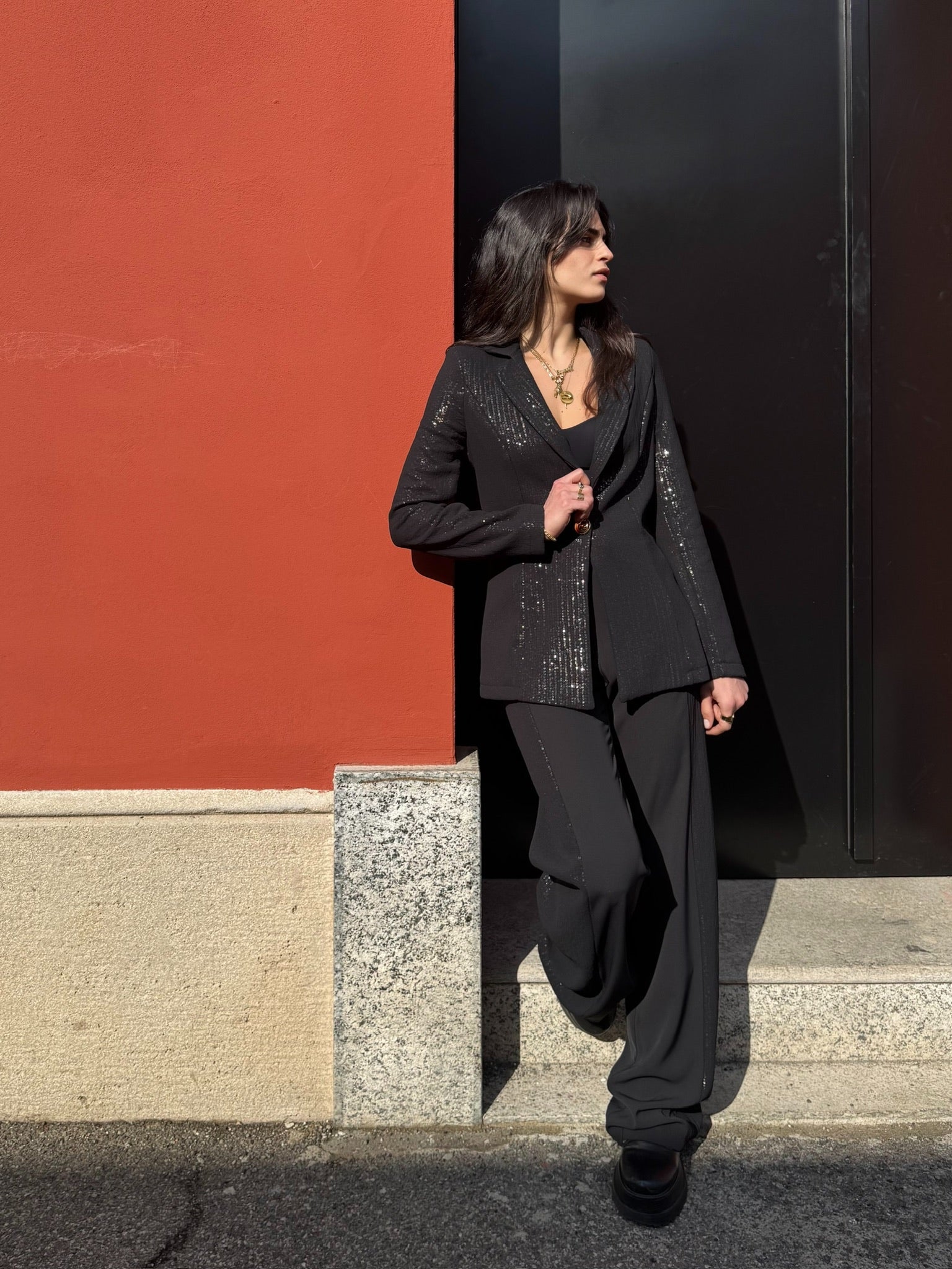 Completo pantalone e giacca con paillettes sotto all'organza che rifinisce la giacca e il laterale del pantalone. Pantalone a palazzo e giacca monopetto. Dettagli dei bottoni oro.