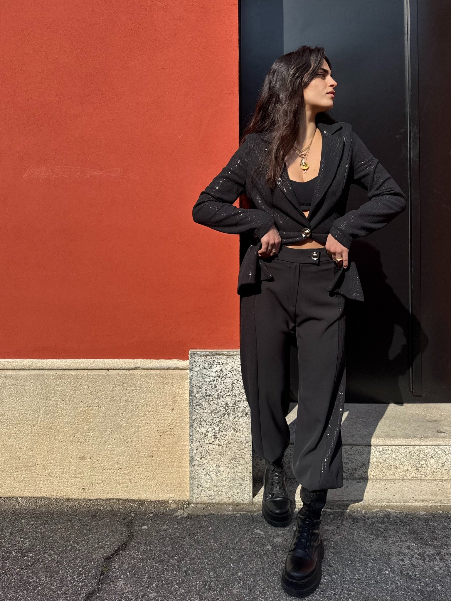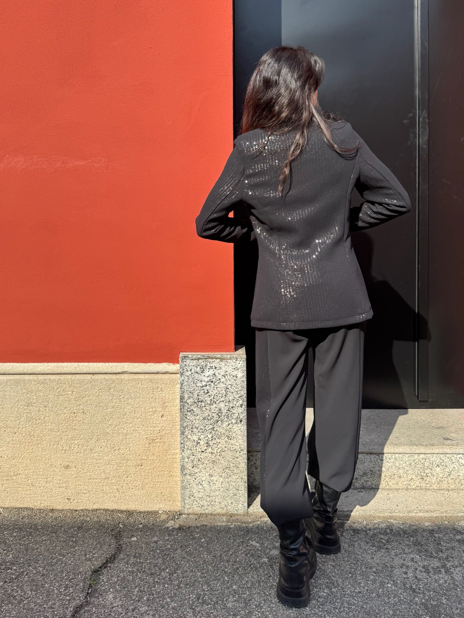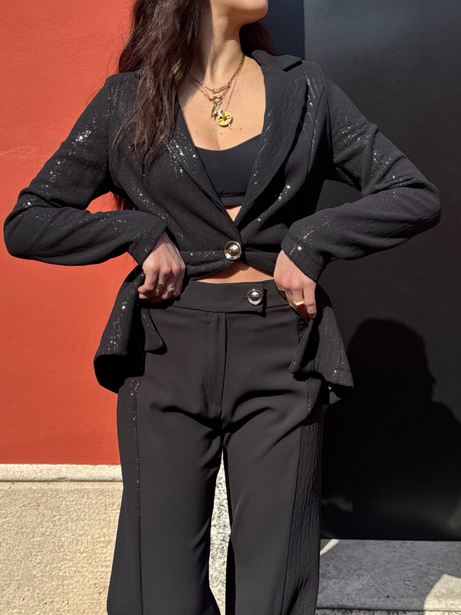 Completo pantalone e giacca con paillettes sotto all'organza che rifinisce la giacca e il laterale del pantalone. Pantalone a palazzo e giacca monopetto. Dettagli dei bottoni oro.