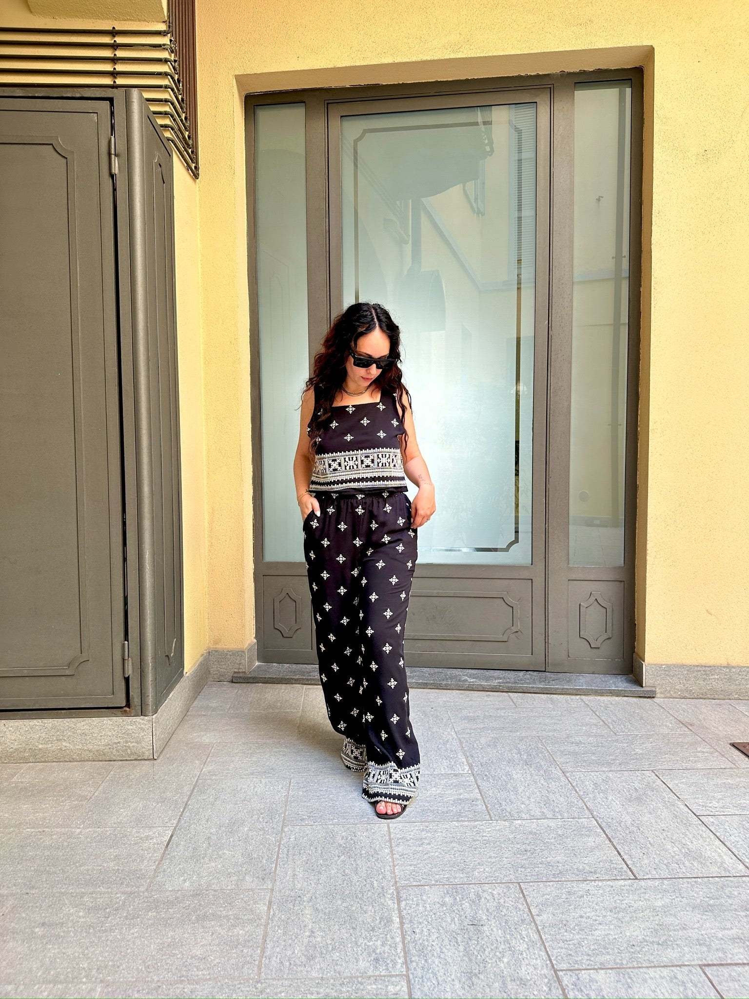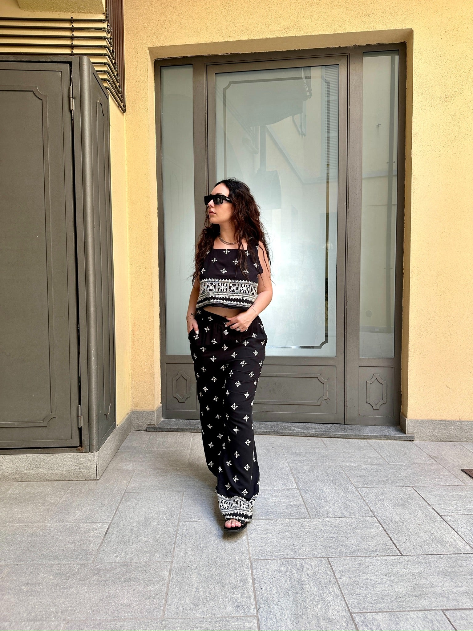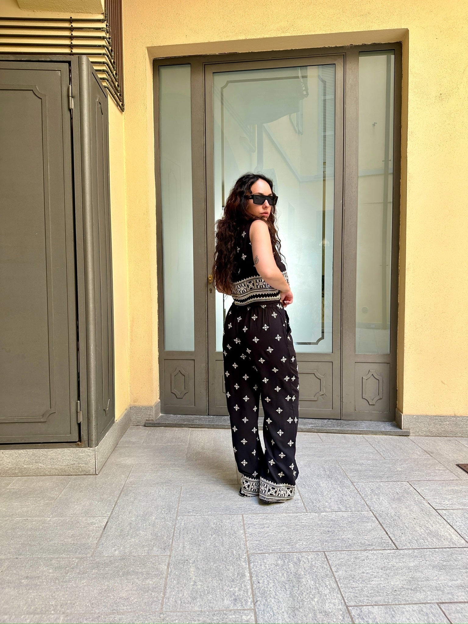 pantalone in stile palazzo con ricami a contrasto con tasche ed elastico in vita.