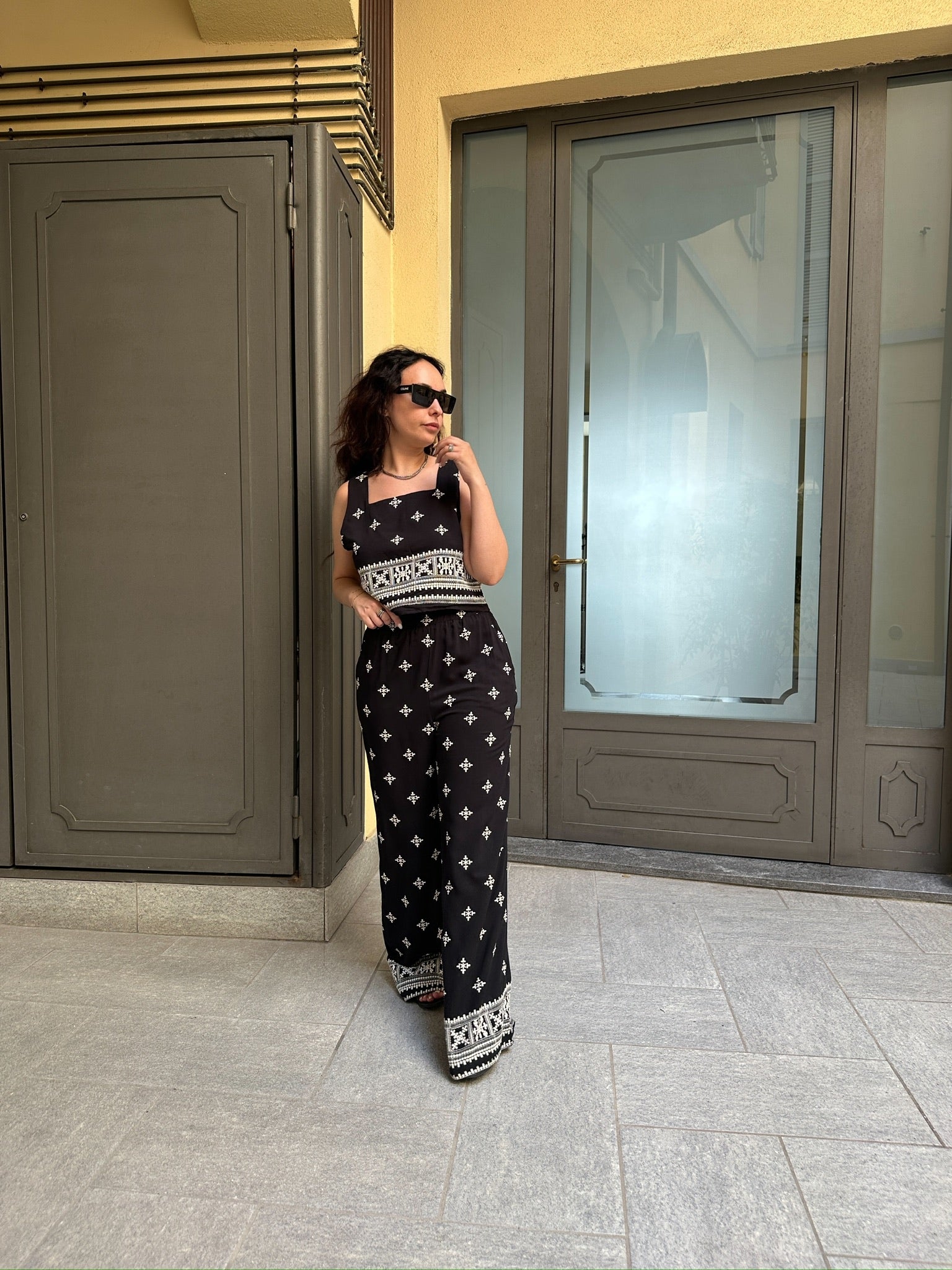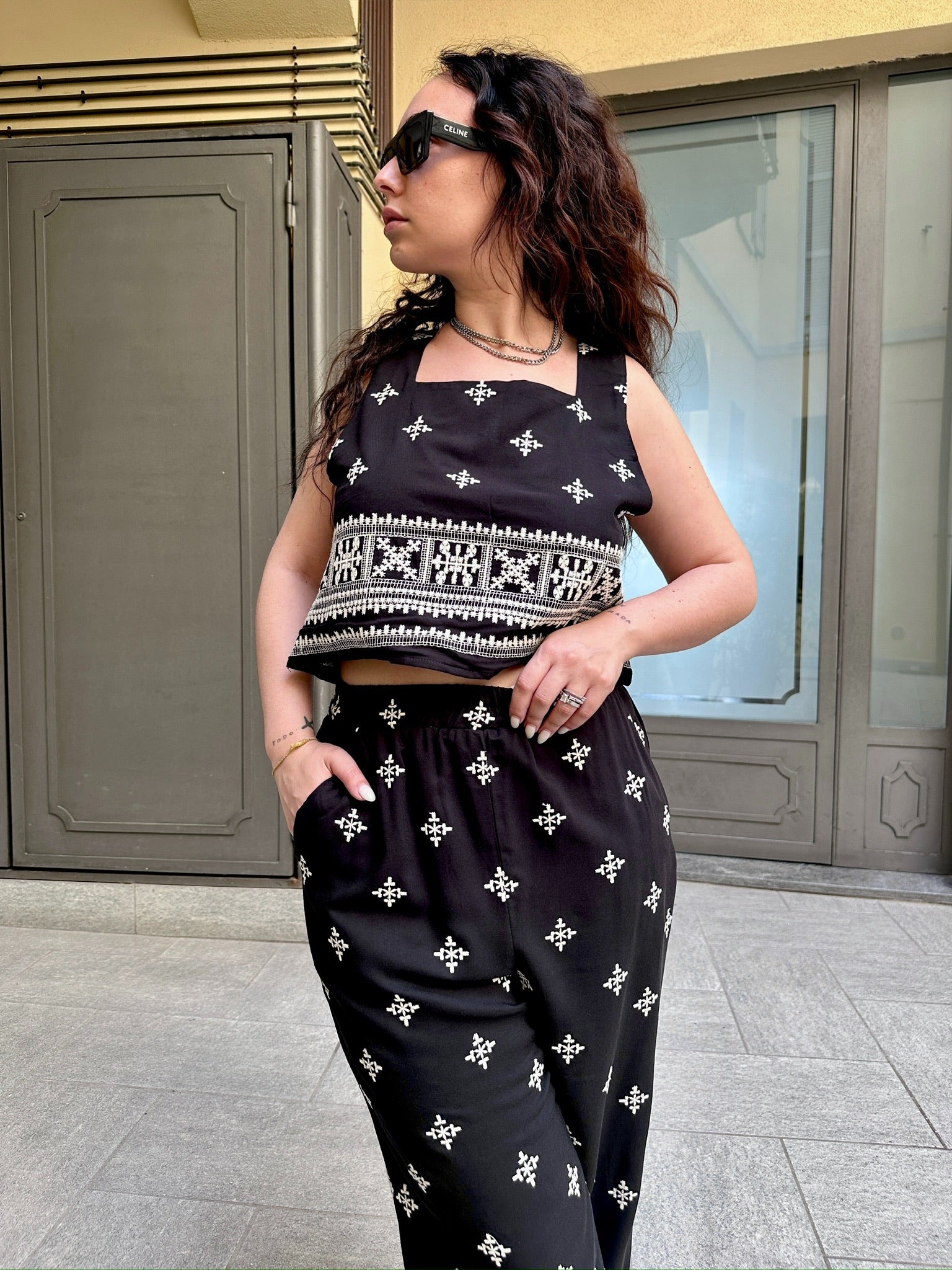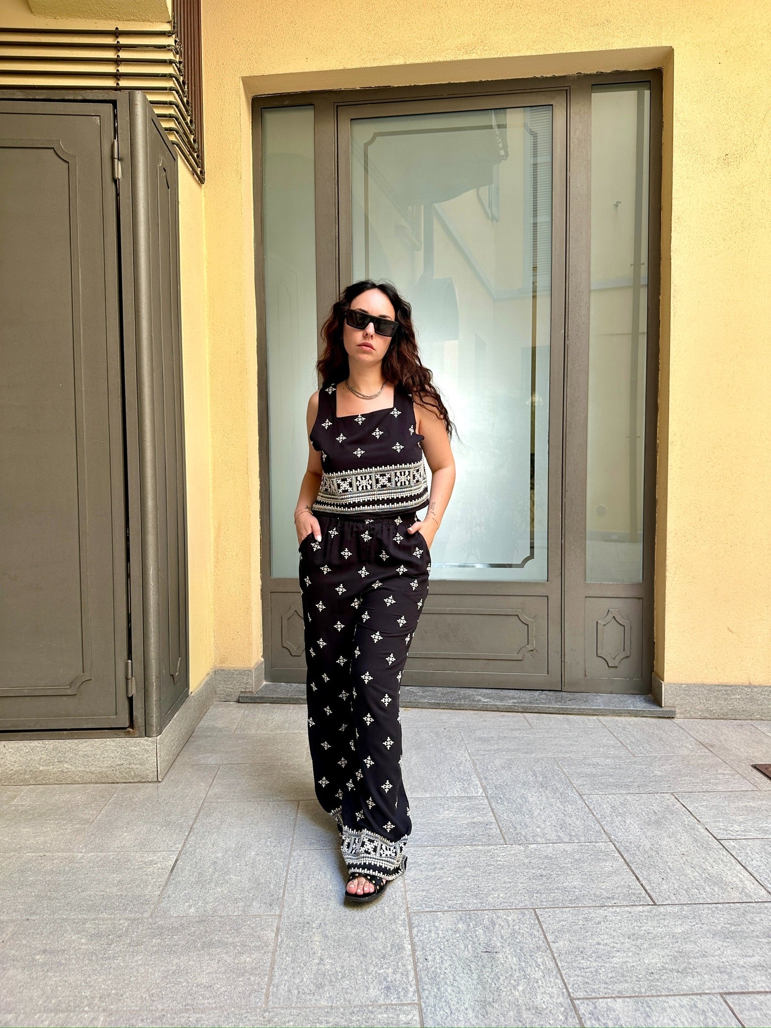 pantalone in stile palazzo con ricami a contrasto con tasche ed elastico in vita.