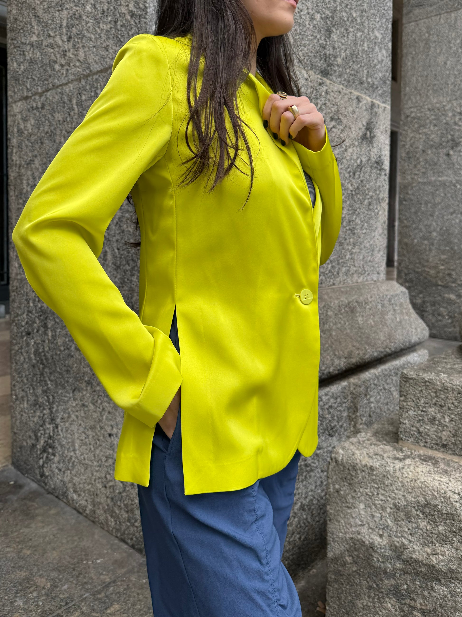 Giacca in 100% viscosa con spacchi laterali chiusura a un bottone, collo a revers.