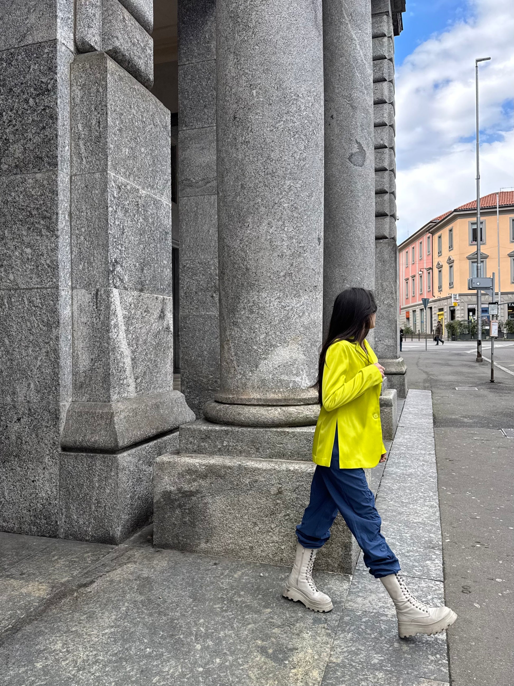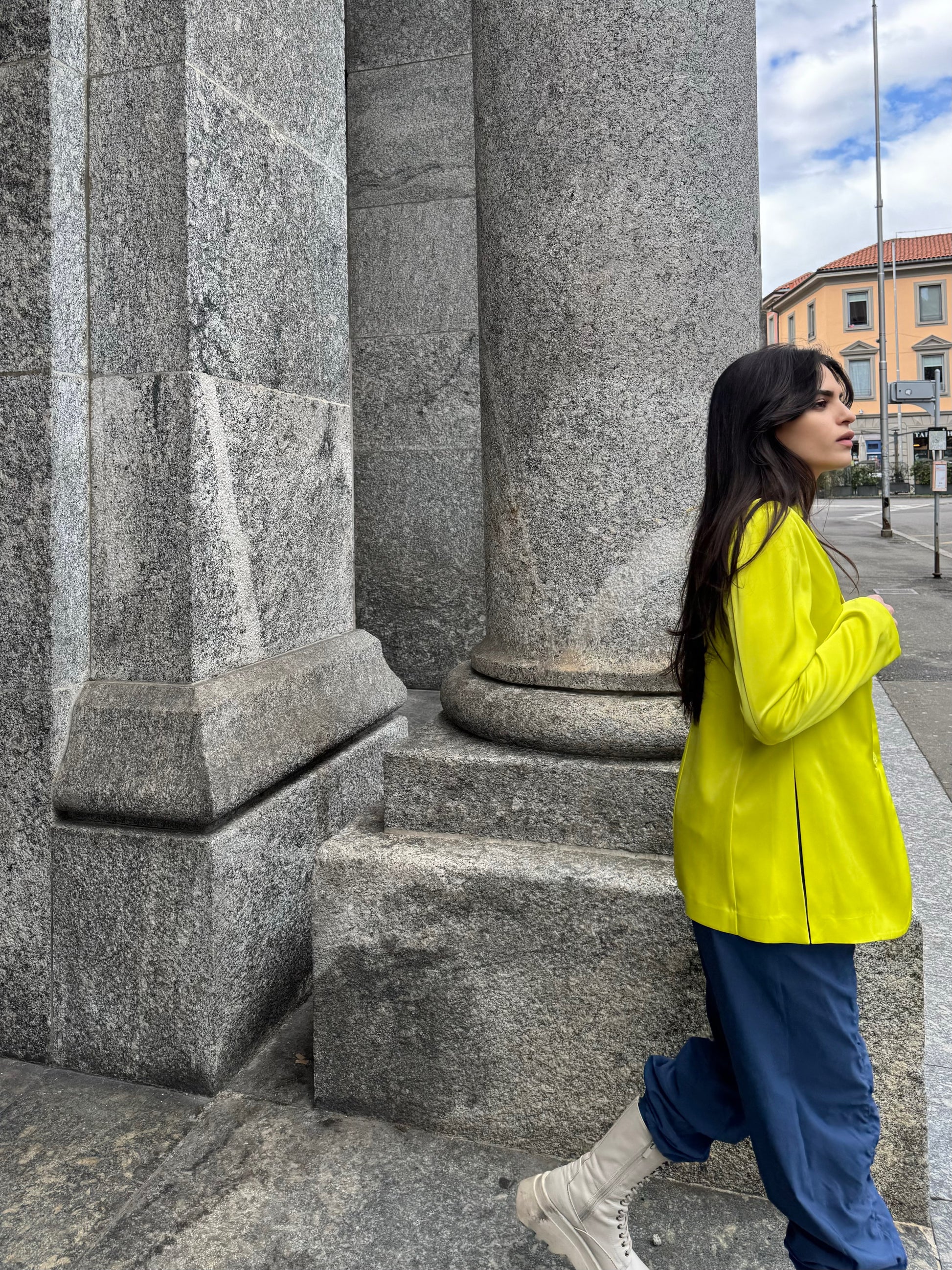 La modella è alta 162 cm e porta una taglia 38, in foto indossa taglia 40.