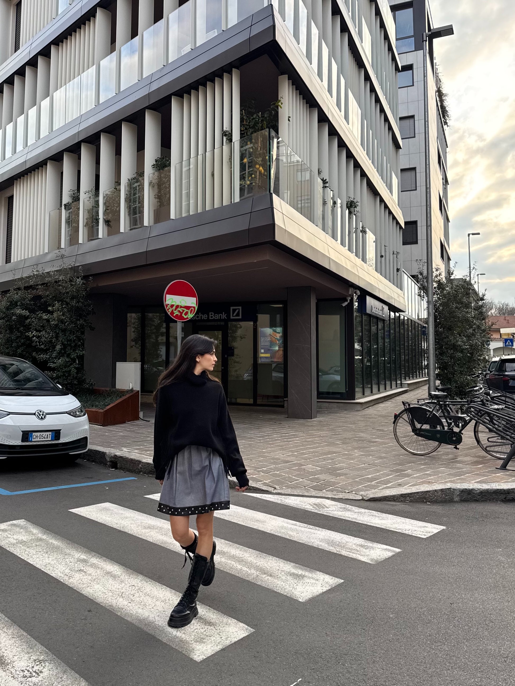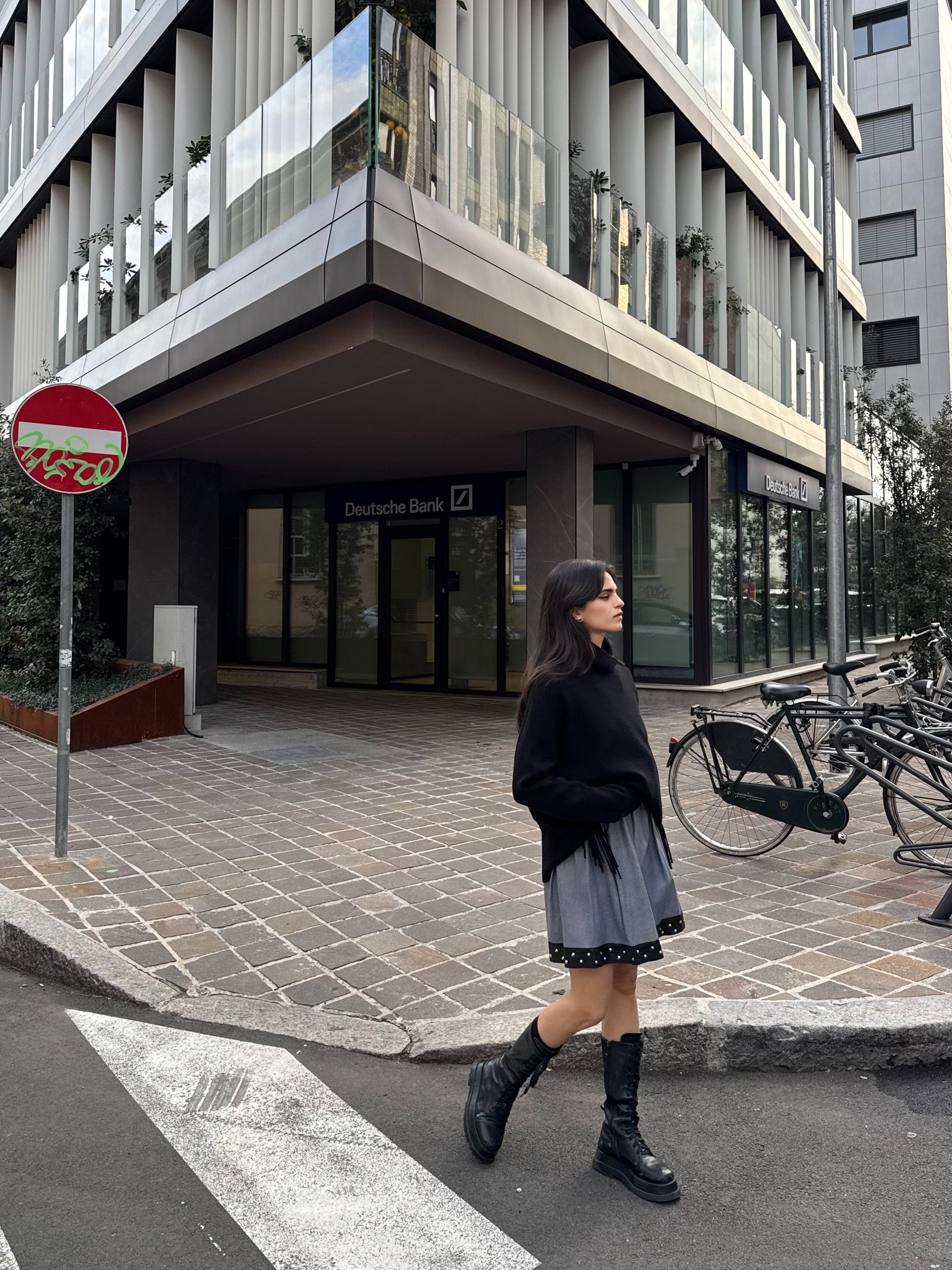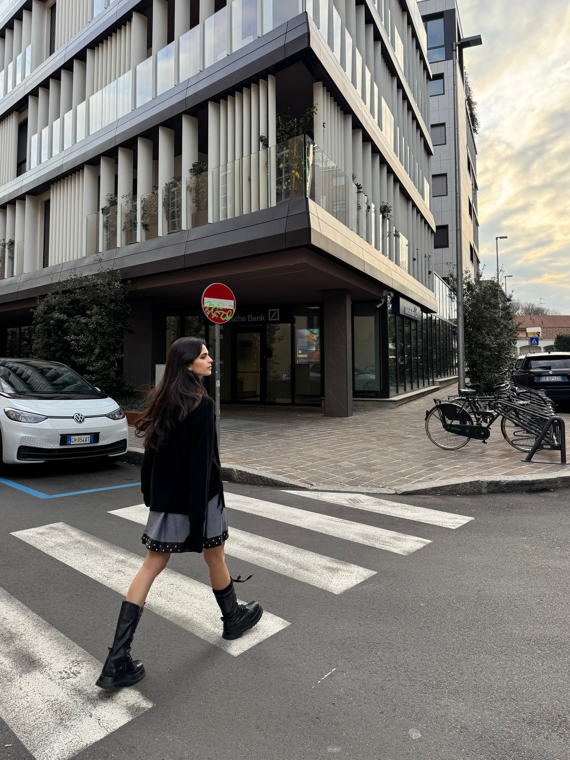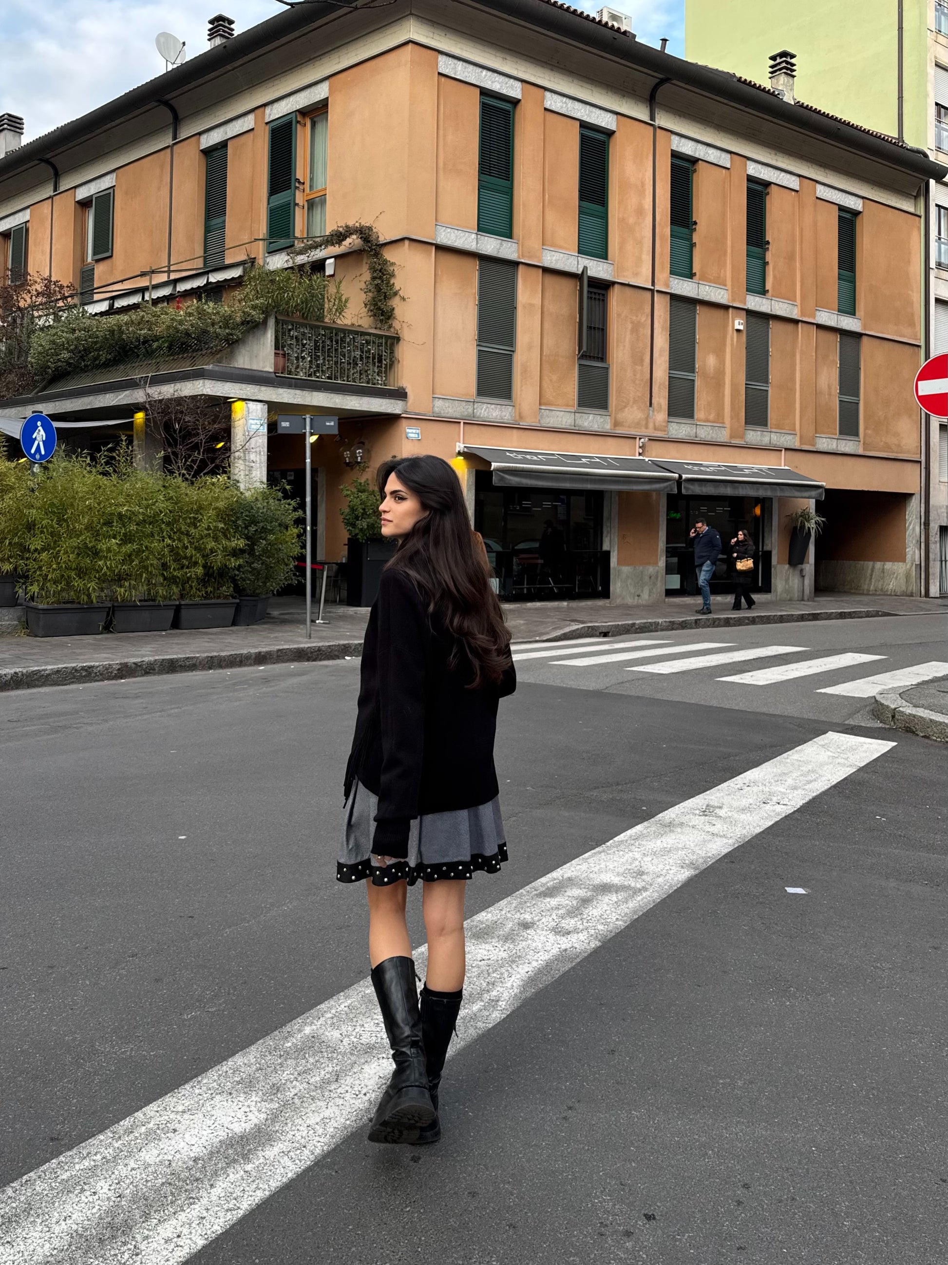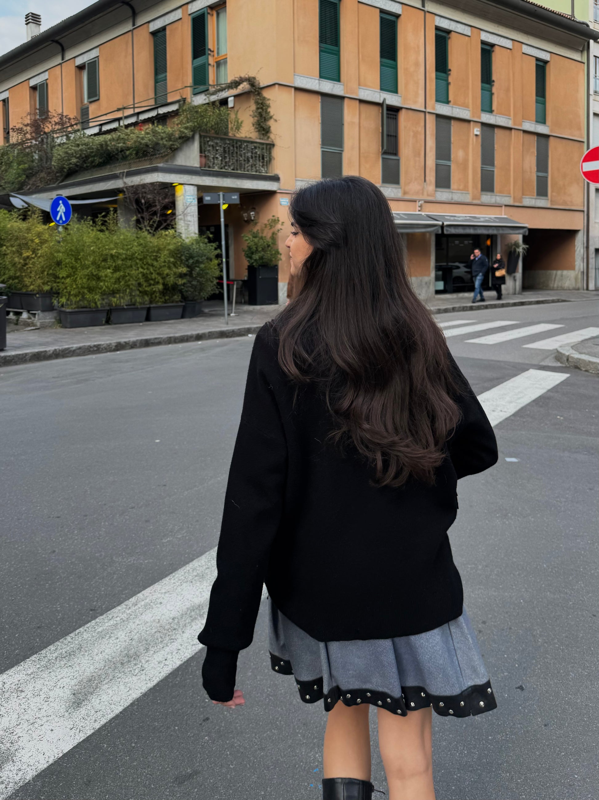 La modella è alta 162 cm e porta una taglia 38, in foto indossa taglia unica che le rimane abbondante.