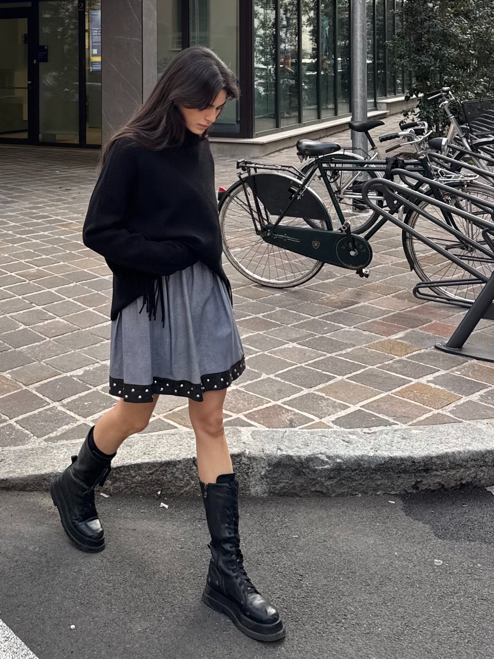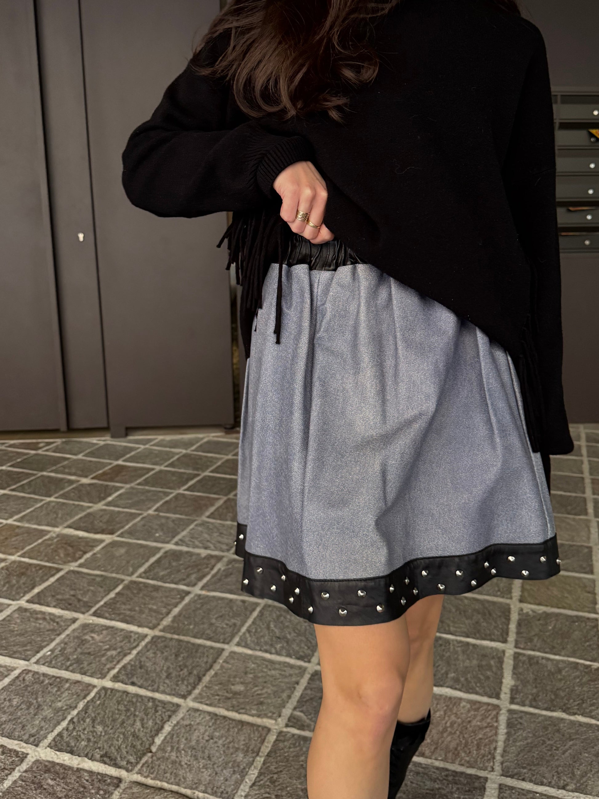 Gonna in 100% vera pelle con pelli a contrasto, effetto jeans per la gonna e bordo e elestico della vita in pelle nera con applicazione di borchie sul fondo. Arricciata in vita e svasata all'orlo.