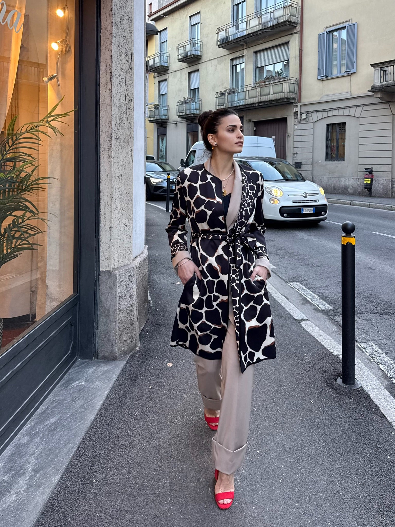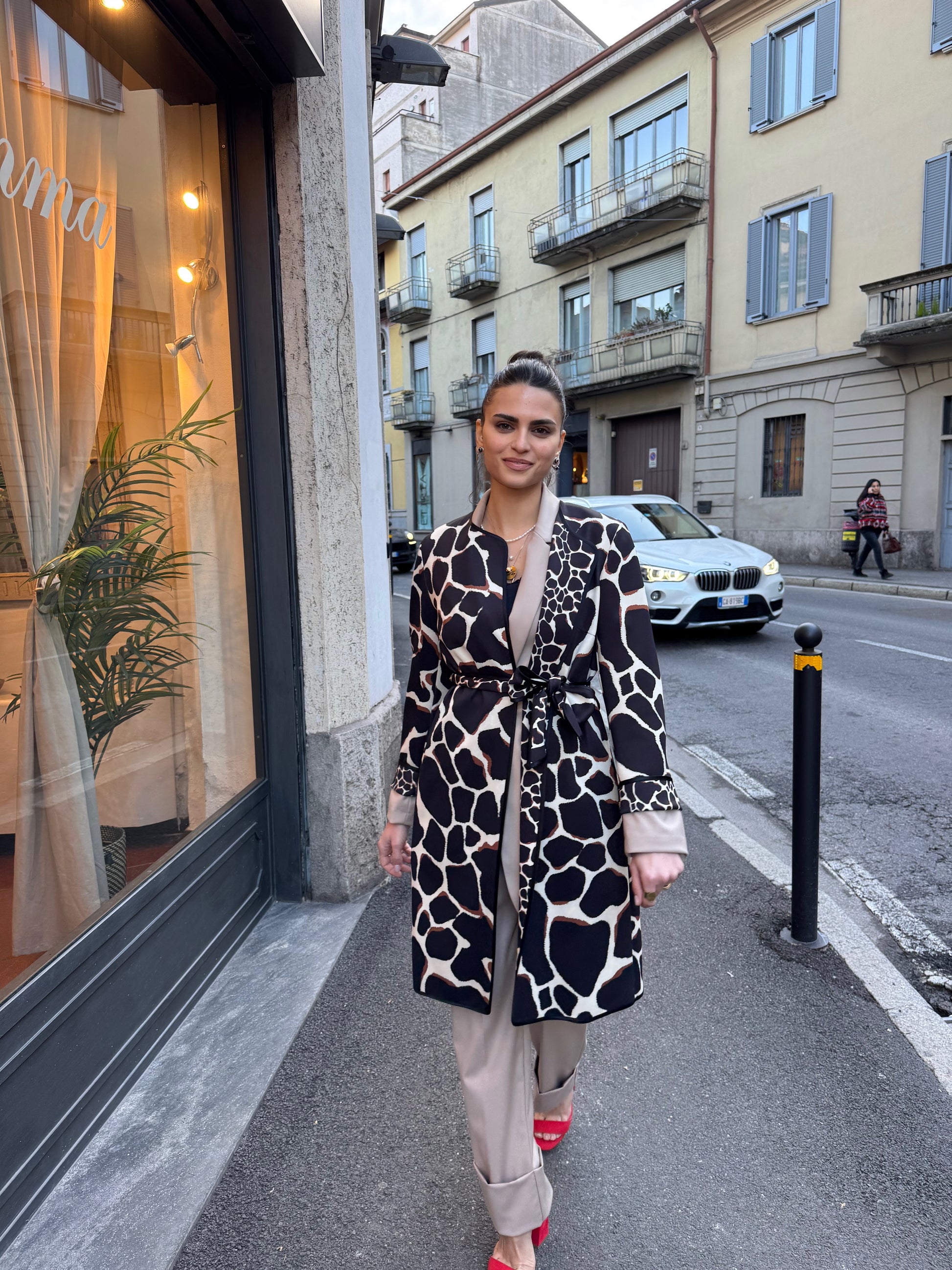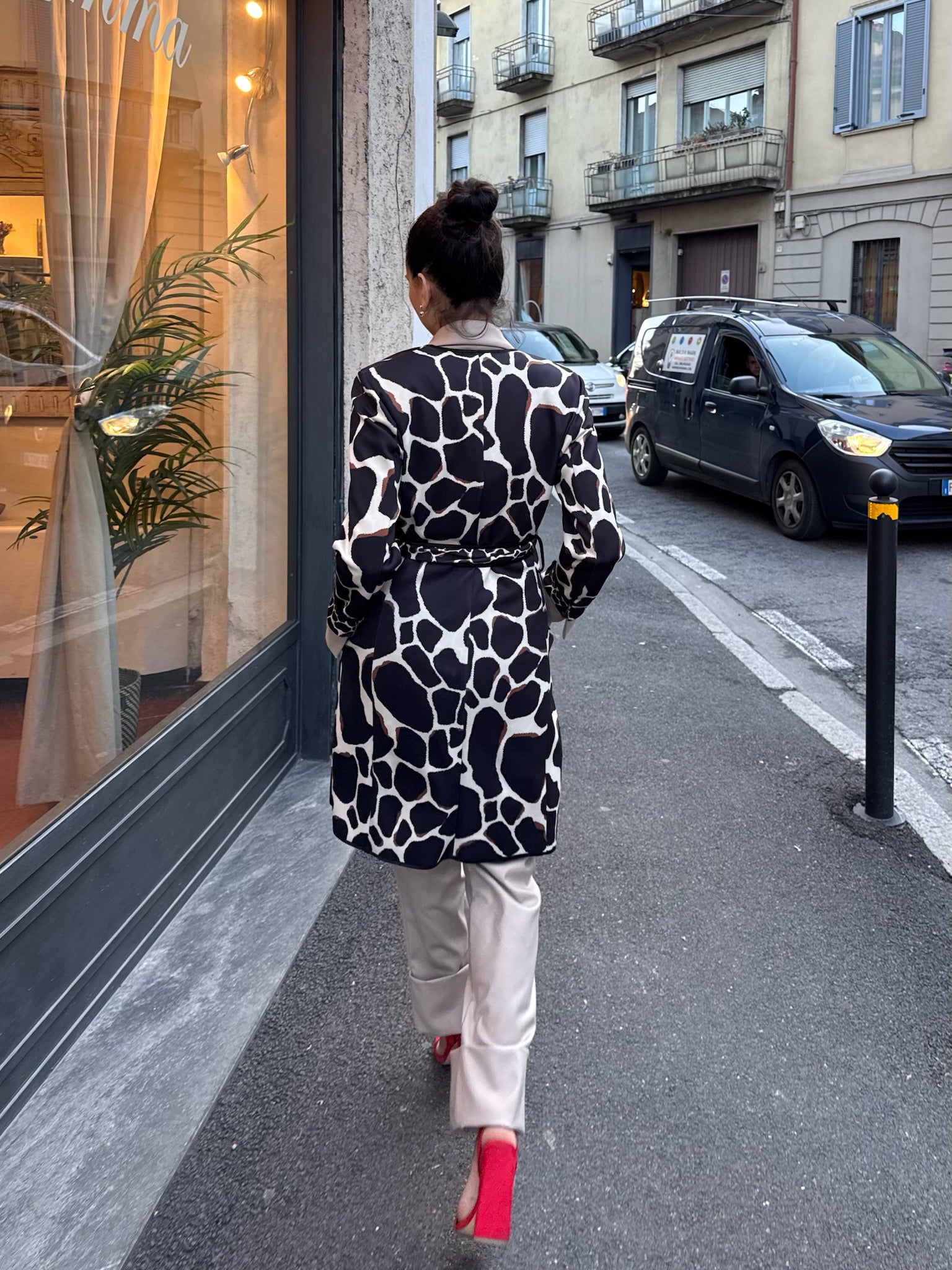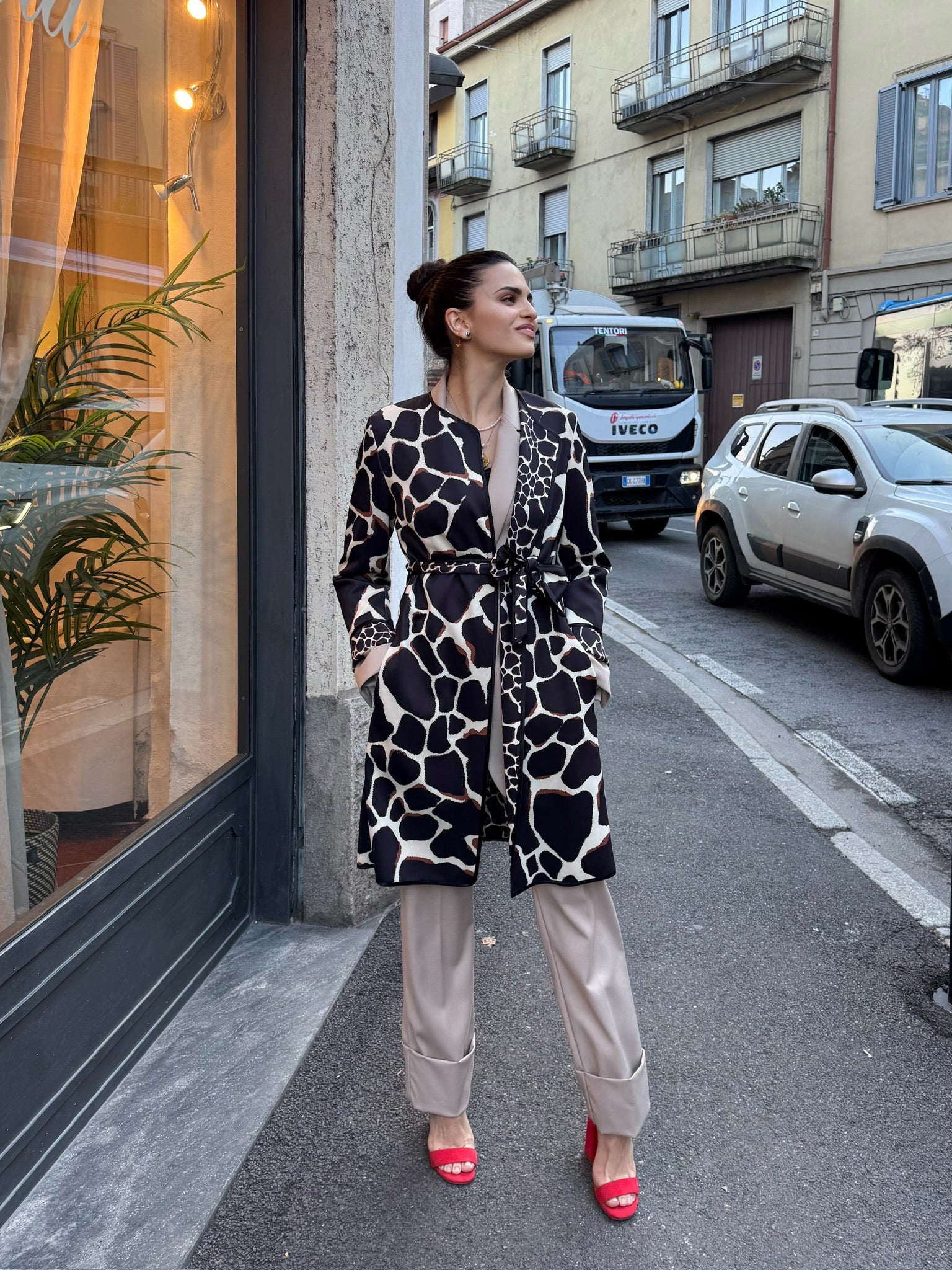 Spolverino girocollo senza bottoni con cintura in vita con fantasia a contrasto come l’interno. Sfoderato. Maxi print fuori e micro internamente. Bordi rifiniti con passamaneria tinta unita.